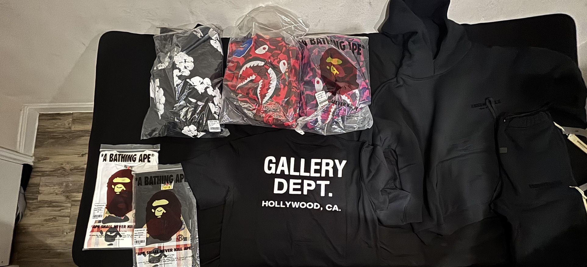 Bape hoodies-$180 Bape shirts-$100 Gallery dept shirt- $100 Essentials outfit $200/150 for just jacket $50 for pants Denim jacket $150