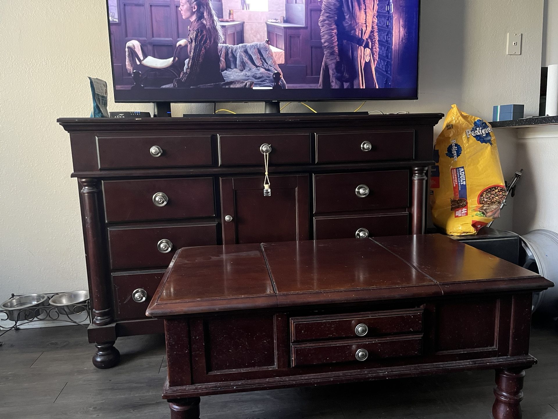 I have a 10 drawer dresser dovetail quality 63 1/2 inches wide by 19 inches deep 42 inches tall . Asking $125 47 “L x 28” W 21”tall coffee table with two hidden drawers and one drawer in the middle Asking $$50
