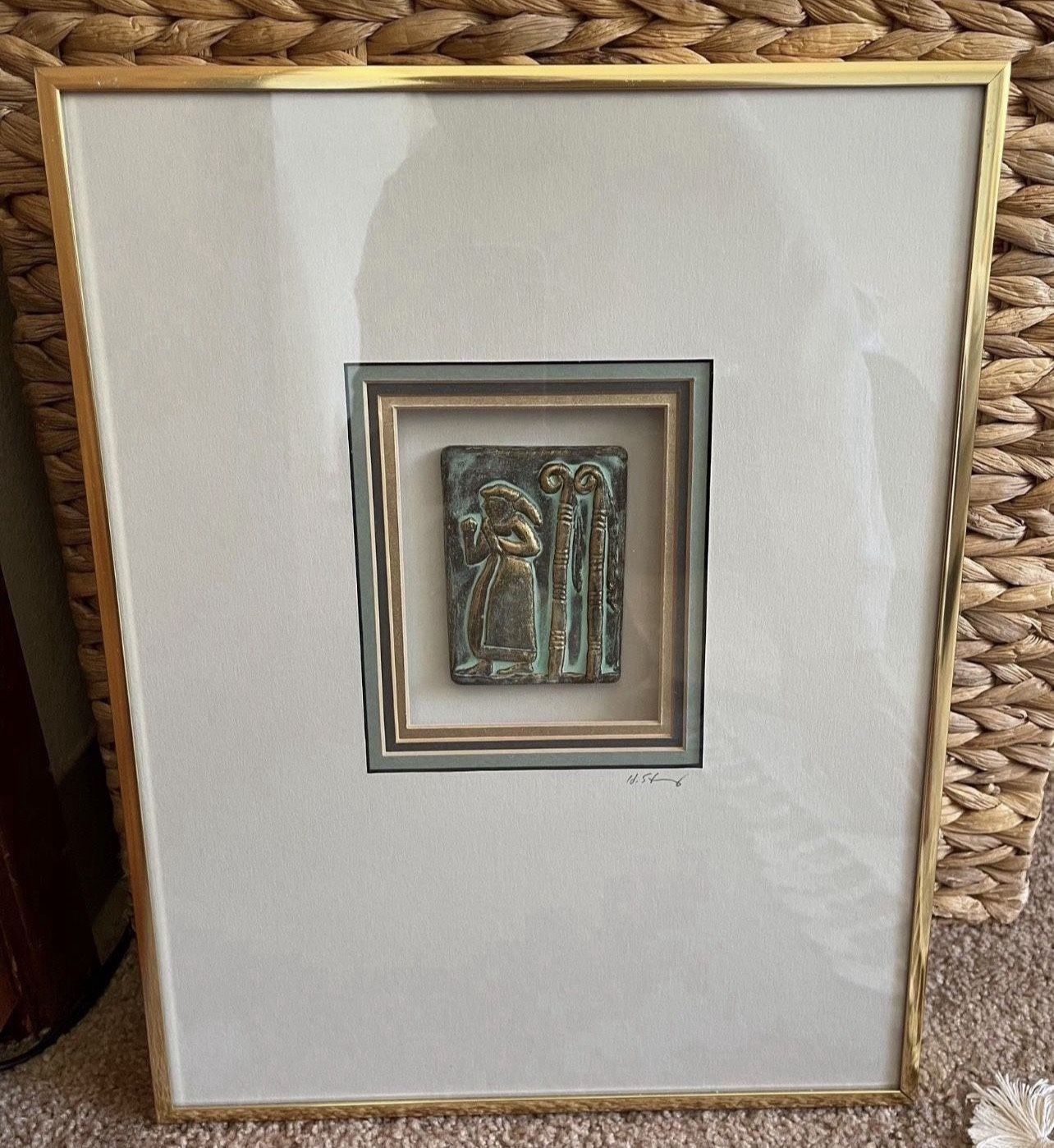 Framed ceramic artwork from the "Sumerian III" series by American artist Harris G. Strong (1(contact info removed)). In great condition ( couple dents, nothing major) * The work is a small, relief ceramic tile depicting a figure with a staff, finished with a green wash to replicate natural aging. * "Sumerian III" one of the series * The piece is housed in a shadowbox frame with a signature on the mat. * Harris Strong was known for his award-winning decorative ceramic pieces and founded Harris G. Strong, Inc. in 1950. Asking $150 OBO
