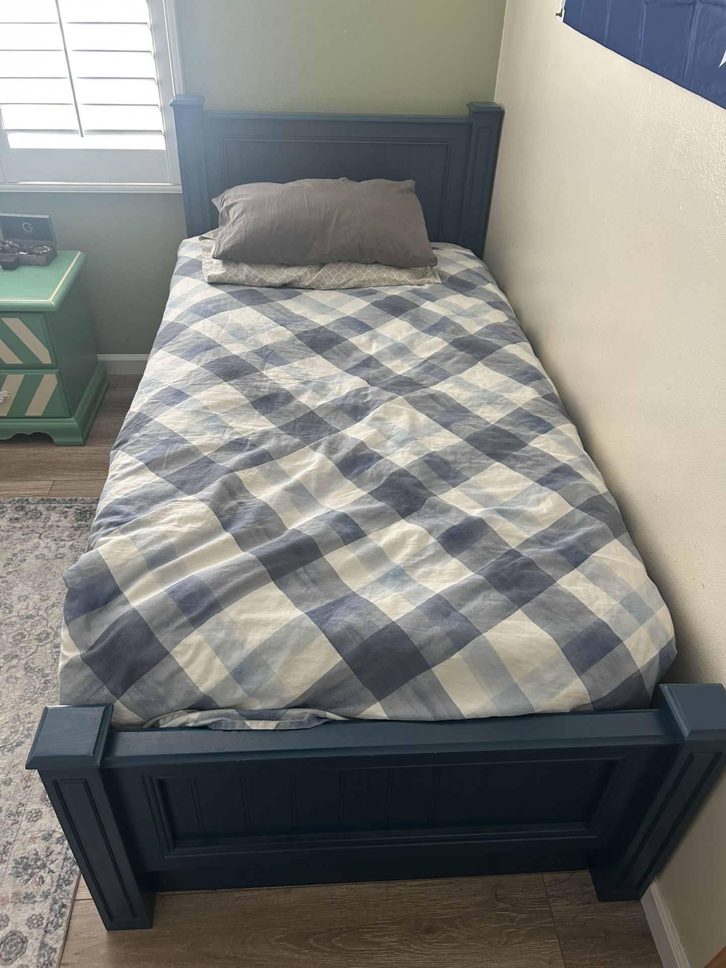 Blue twin sized bed frame Good condition Original price 1200 Strong thick wood frame Built in spacious drawers Dark blue colors