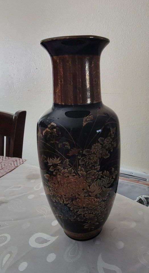 Rare Vintage Japanese Porcelain Black Vase Gold-Trim Floral W/ Oriental Flowers