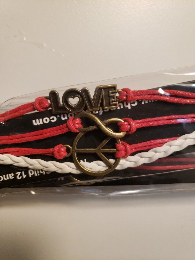 Brand New Faux Leather corded with charms Adjustable length Love, Infinity, and Peace charm Bracelets Red and White color faux leather. 5 in quantity