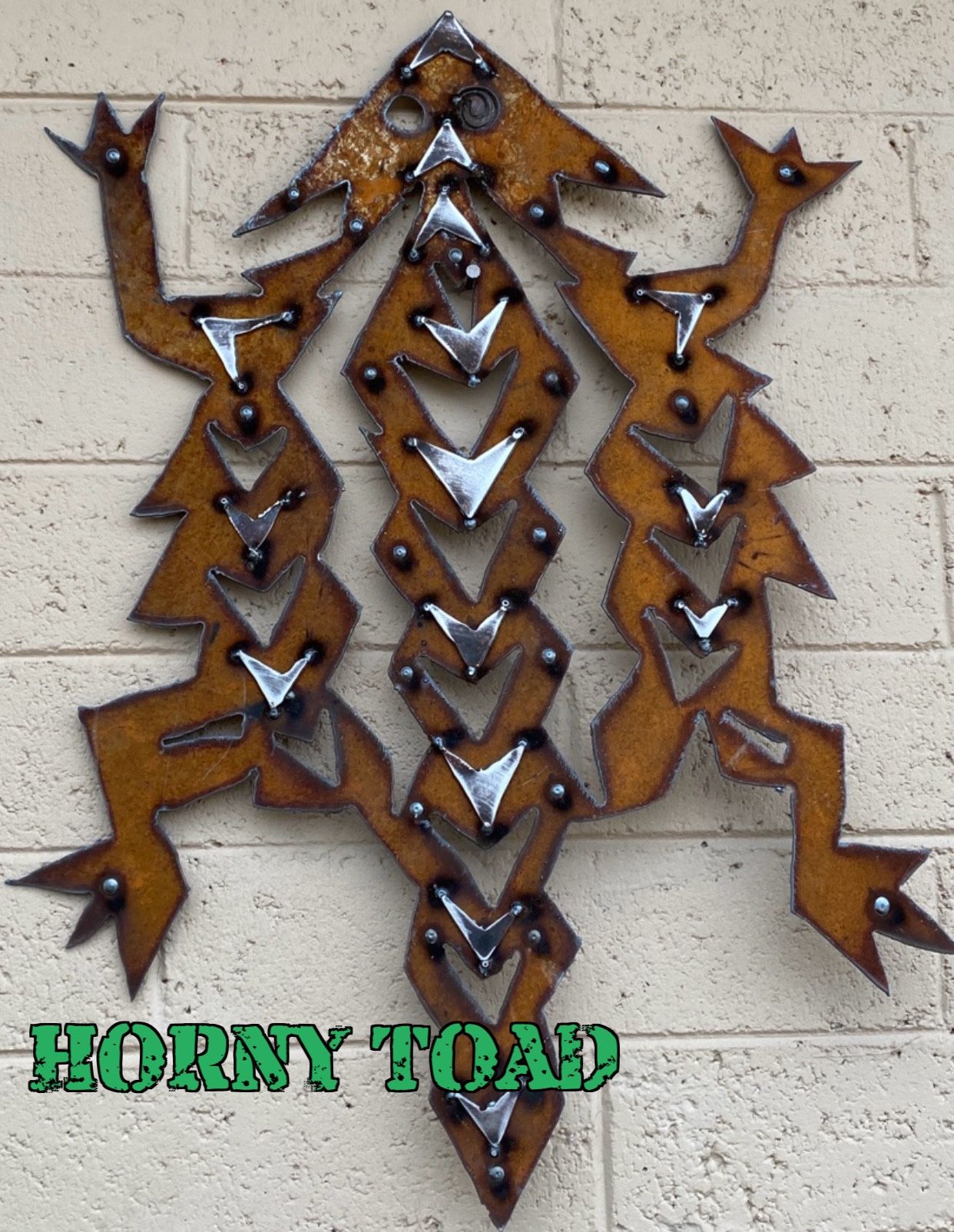 Metal Art Cut Outs Great for Yards, Wall, Indoors Custom Sizes Available Can be mounted on pole for yard or indoors Great Gift for the Holidays! Javelina 7.5”x11” - $30. Each Fish 3.5”x9.5”20. Each Small Horny Toad - $45. Horse 10.5”x6”- $20. Each Large Frog 20”x18” - $50. Large Horny Toad 25”x18” - $150. Monkey - $25. Snake $25. I’m art garden special gift decor decoration steel aluminum vintage animal barn