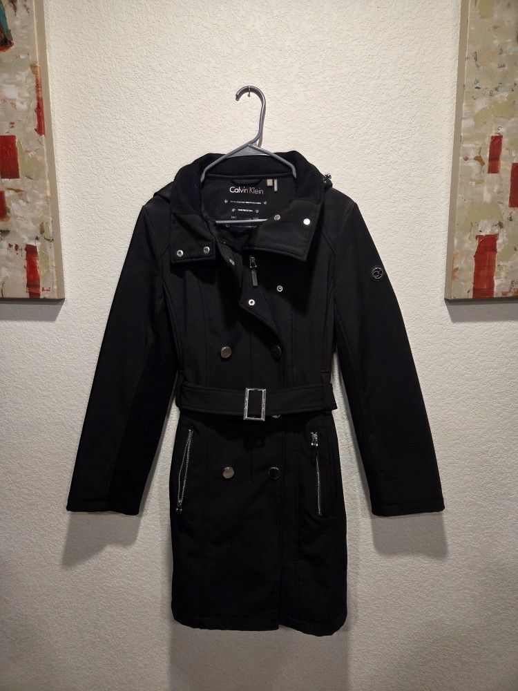 Black coat with belt and zipper pockets. Adjustable and removable hood. Never worn.