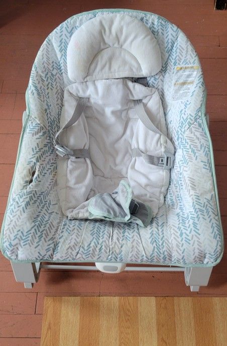 Baby rocker chair is preowned with stains and scuffs, scratches and has straps and secure belt to prevent child from falling off. It's still has a lot of life to it and still can be used. The white cushion needs to be washed and it's removable. It also vibrates and will need batteries. NEED GONE ASAP!! Message me if you're interested!