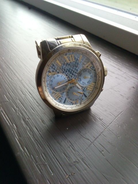 Elegant gold stainless steel timepiece. Waterpro -water resistant Created by GUESS Stainless steel clasp Blue chrono multi dial face