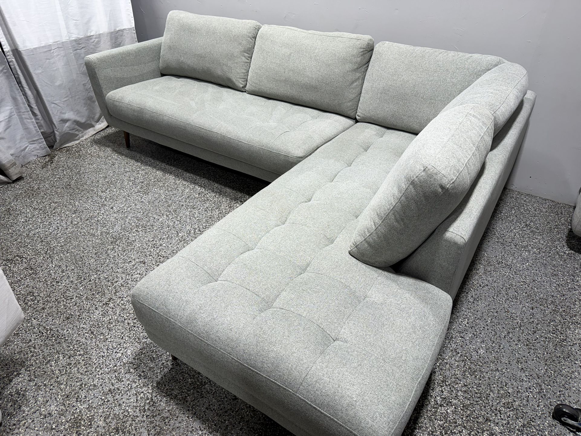 This is a 2 piece sectional couch from living spaces in excellent condition! No stains or tears and cushions are plush and comfortable. Back cushions are removable and washable and bottom cushions are fixed it. It has been steam cleaned and can be delivered for free within 20 miles 108 x 85