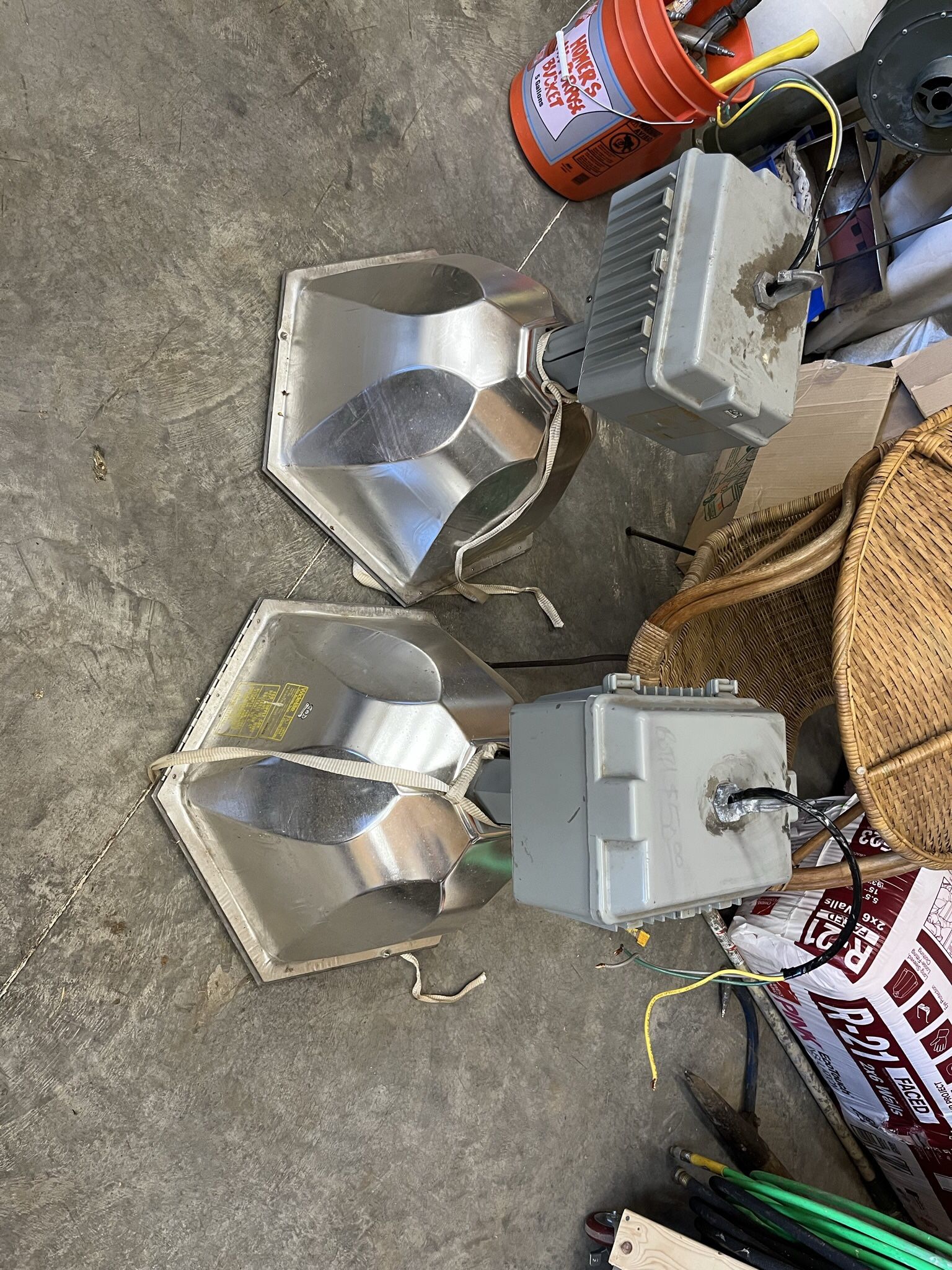Two working metal halide shop lights. Wired for 110 volts right now but can be changed to other voltages by changing the taps. Comes with hooks on top so they can be easily hung with a screw eye. These were in my shop and put out a ton of light