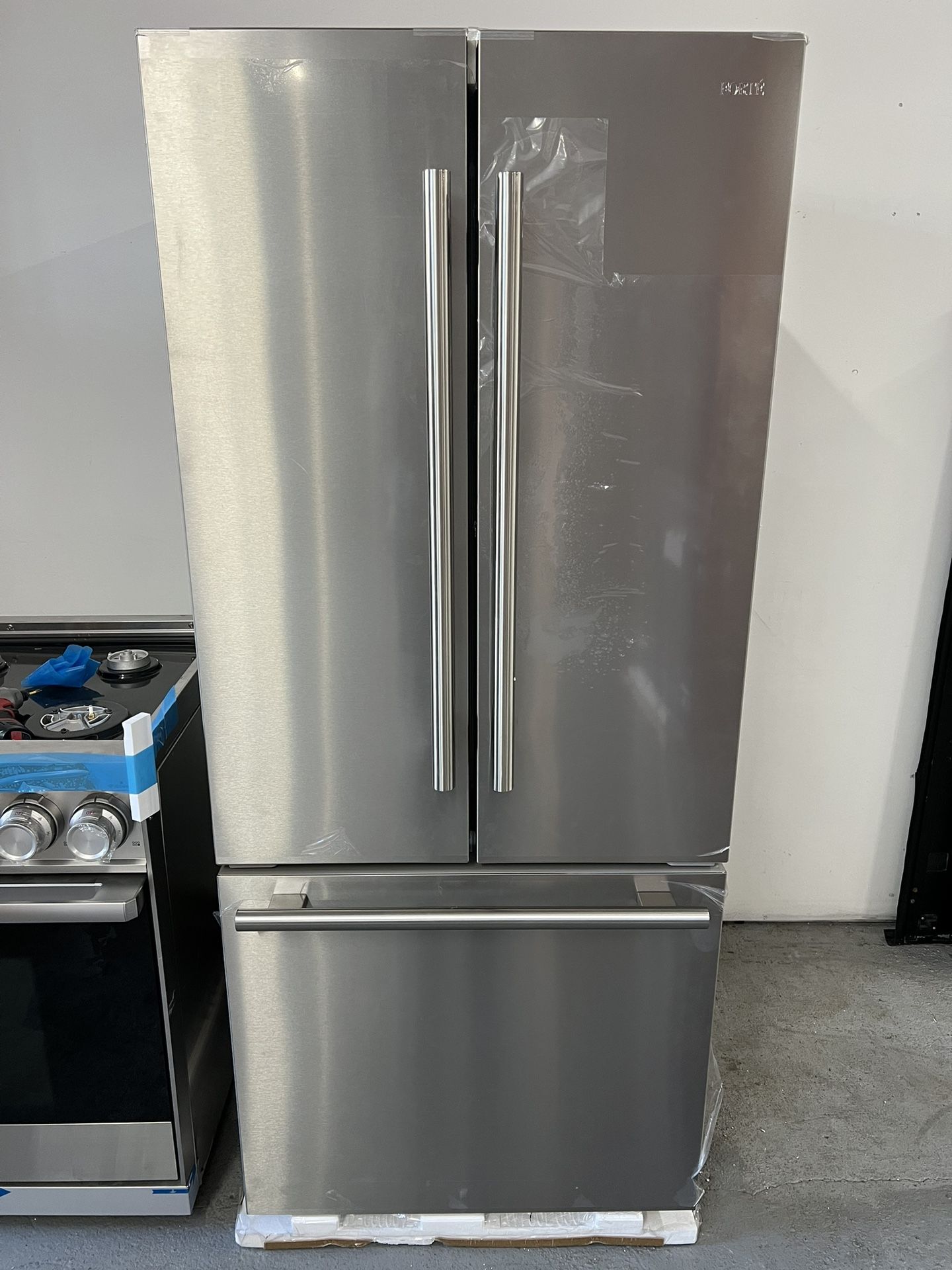 Brand new in box stainless steel 3 door 30” inch width refrigerator with ice maker