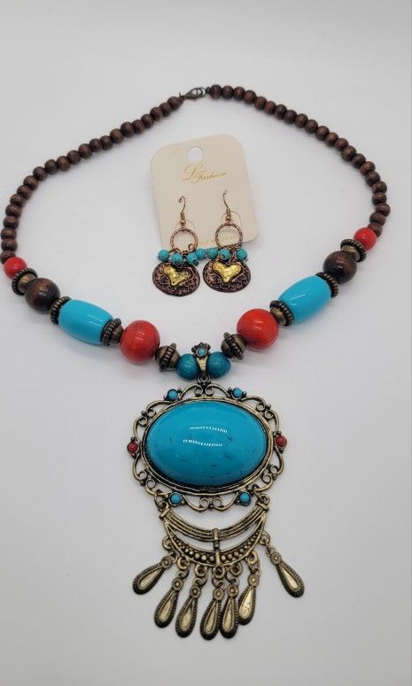 Beautiful and Unique Fashion Wood Beaded Necklace Set with Imitation Turquoise Pendant and Bronze Metal Details. New