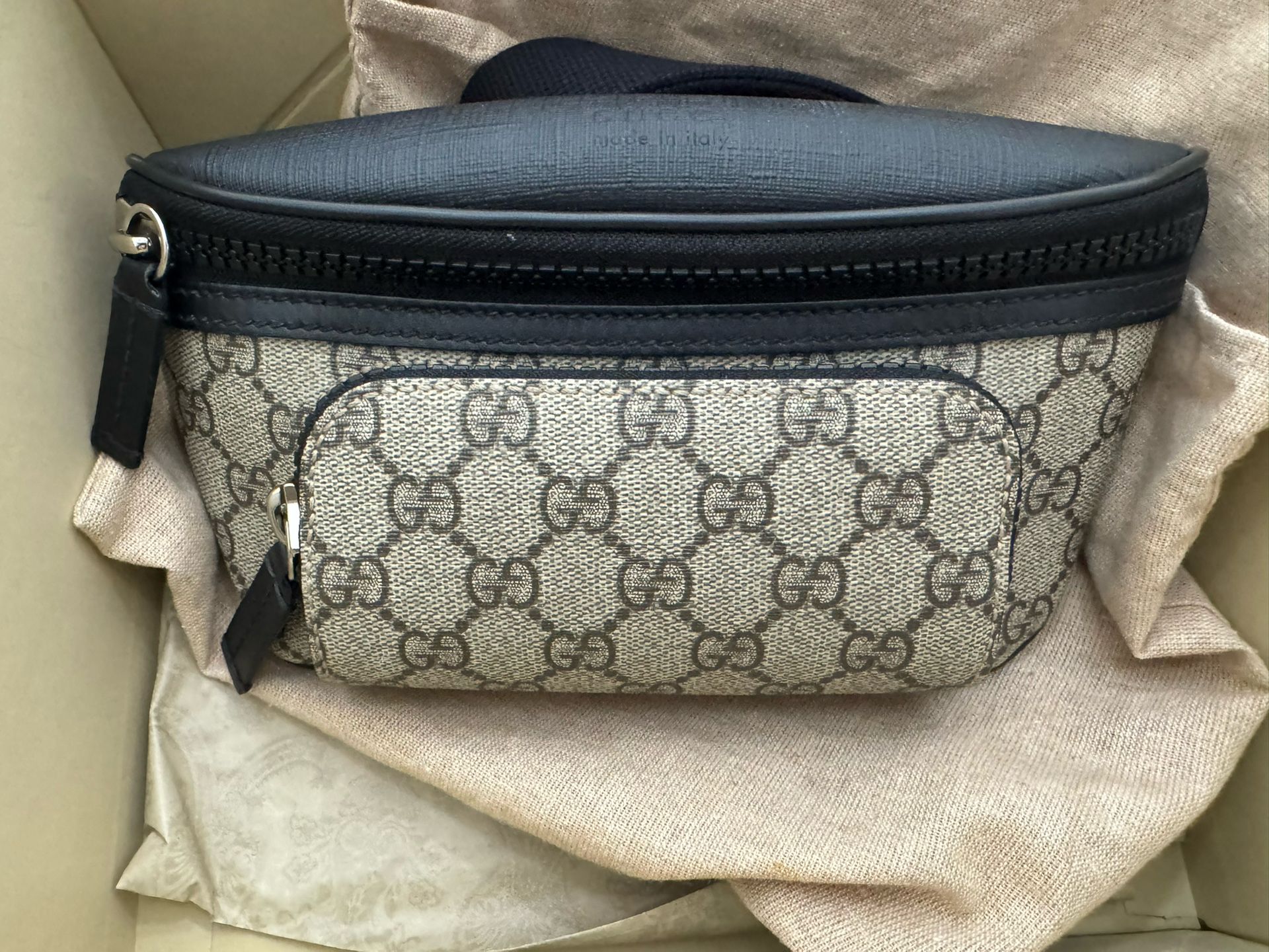 ***no low ball offers*** item in great condition, I rarely used it. This is an authentic GUCCI GG Supreme Monogram Belt Bag in Black. I have an authentication paper that can confirm authenticity, will show upon pick up. This chic belt bag is finely crafted of Gucci GG supreme monogram on coated canvas, with black leather trim, and a top crest. The bag features a front and rear zipper pocket and an adjustable black canvas belt strap with a plastic buckle. The polished silver top zipper opens to a dark taupe microfiber interior.