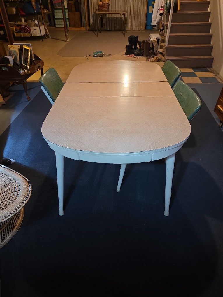 Darling, sturdy table with 3 chairs. 1 leaf. For the person who likes quaint cool vintage. It's a really fun table. Table legs are really removable for transport. Leaf = 11 3/4" Table with leaf 85" long × 35 5/8" wide.