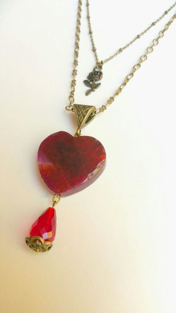 A Warm Heart handmade necklace with real red agate pendant and red crystal beads and a rose charm on antique bronze colored chains