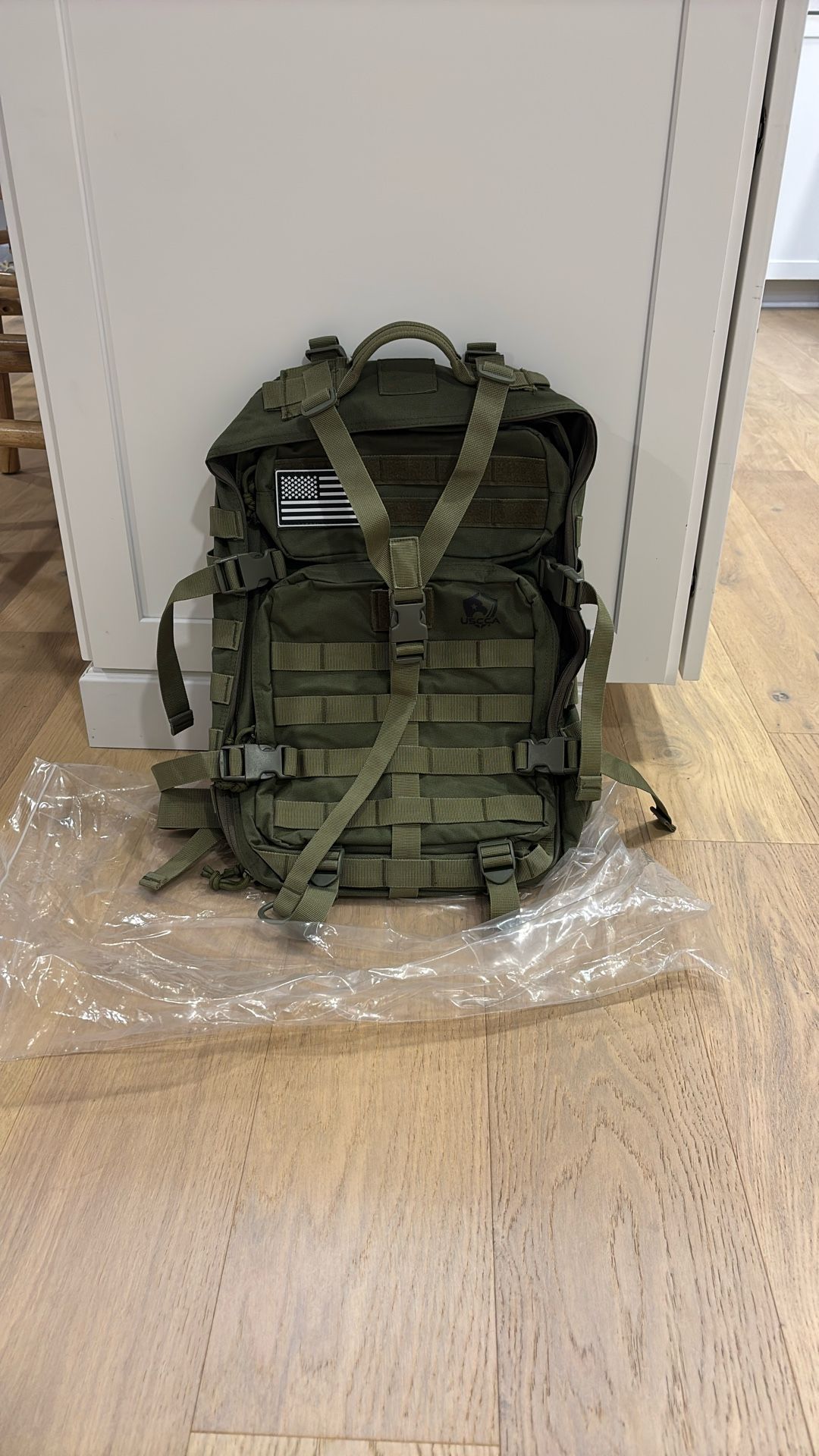 Army green - brand new. Use for hunting, fishing, any outdoor activity - heavy duty canvas.