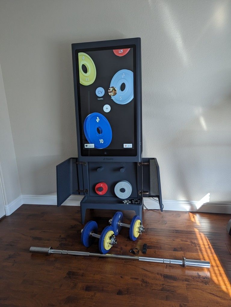 Free Standing Fitness Studio, includes all weights, barbell, heart rate monitor. 42" touch screen, automatic weight recognition. Subscription required for 100s of workouts.