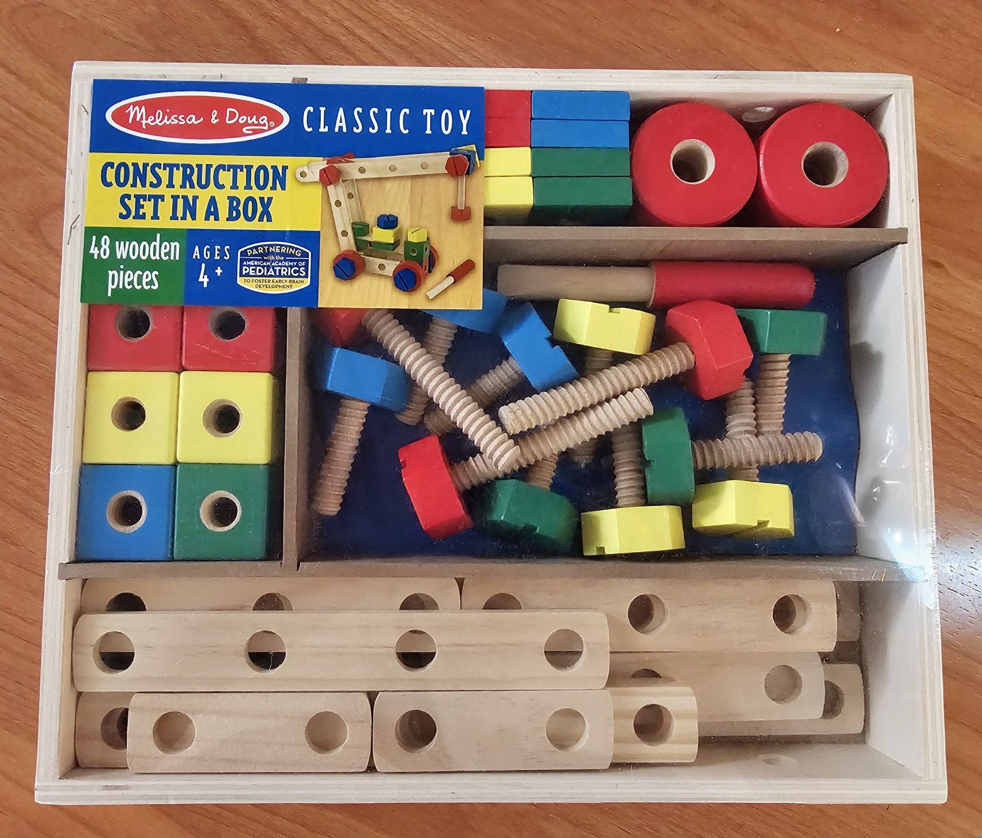 Brand New in original packaging. Pick up only. • 48-piece wooden building set Includes 12 bolts, 8 nuts, 16 building boards, 6 blocks, screwdriver, and storage box; illustrated building guides show how to create a crane, motorcycle, airplane, and race car • Storage box is predrilled so it can become part of a structure too; • Promotes counting, sorting, and fine motor skills; encourages problem solving and constructive play • Makes a great gift for preschoolers, ages 4 to 6, for hands-on, screen-free play