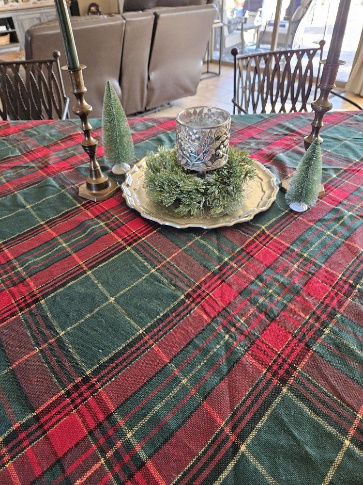 Holiday tablecloth with Metallic threads and scalloped edging. 66 inches round.