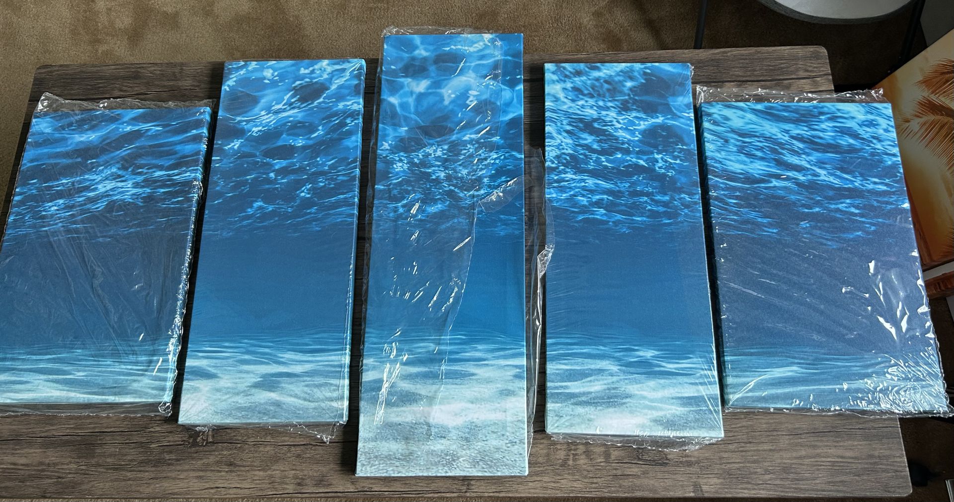 5 piece framed canvas. Under water scene wall art. Never used and still (mostly) in the original shrink wrap. See pictures for dimensions.