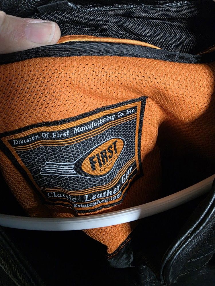 It is authentic riding gear made from genuine cowhide leather. The manufacturer, First Manufacturing Co. Inc., was established in 1987. The gear includes features of concealed carry pockets and a removable thermal liner. The brand focuses on durable, functional apparel for bikers. $75 OBO good condition never worn.