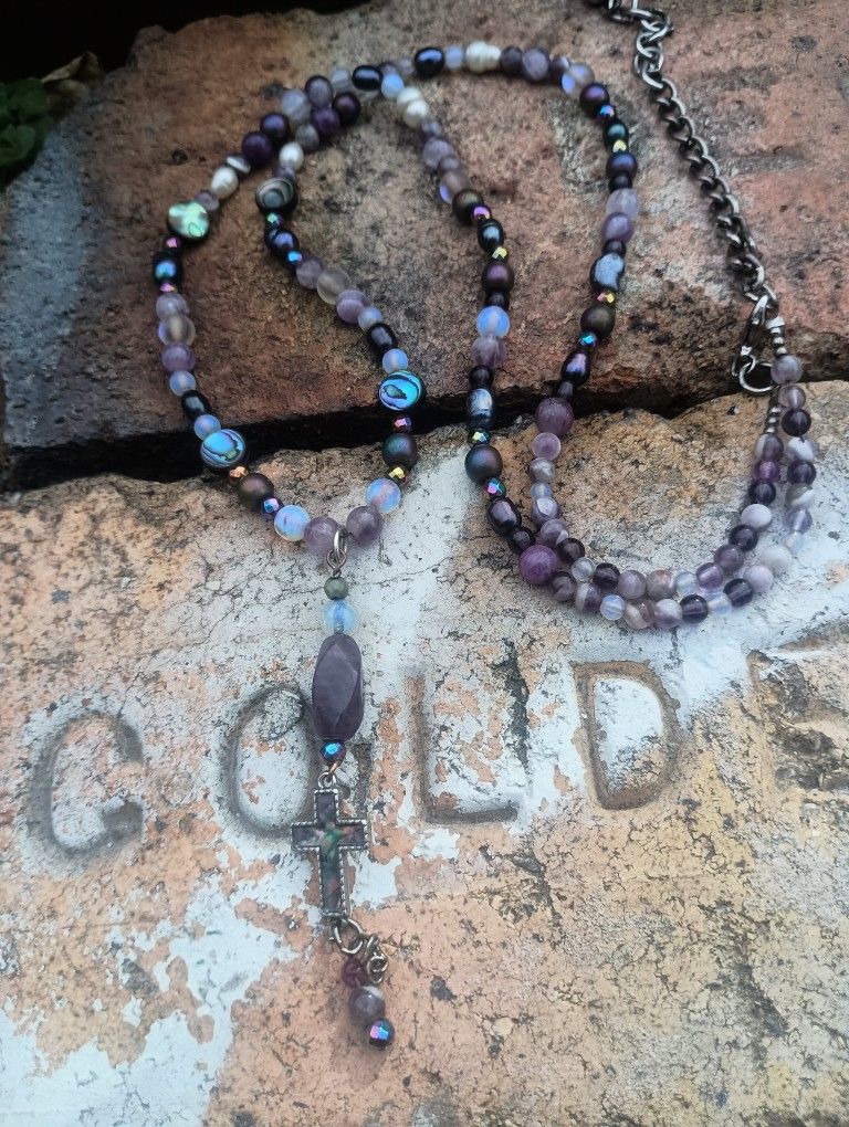 Hand Crafted Brand New High Quality Designer Piece Perfect for Easter π Long Necklace with Abalone, Real Purple Pearl, Real White Pearl, Amethyst, Opal & Rainbow Hematite with a Pedant of Amethyst, Abalone Mother of Pearl Cross and Charm. I have a pearl bracelet and other bracelets that coordinate with this classy necklace. This necklace is full of healing and tranquility with the precious gems and pearls. Necklace for only $20