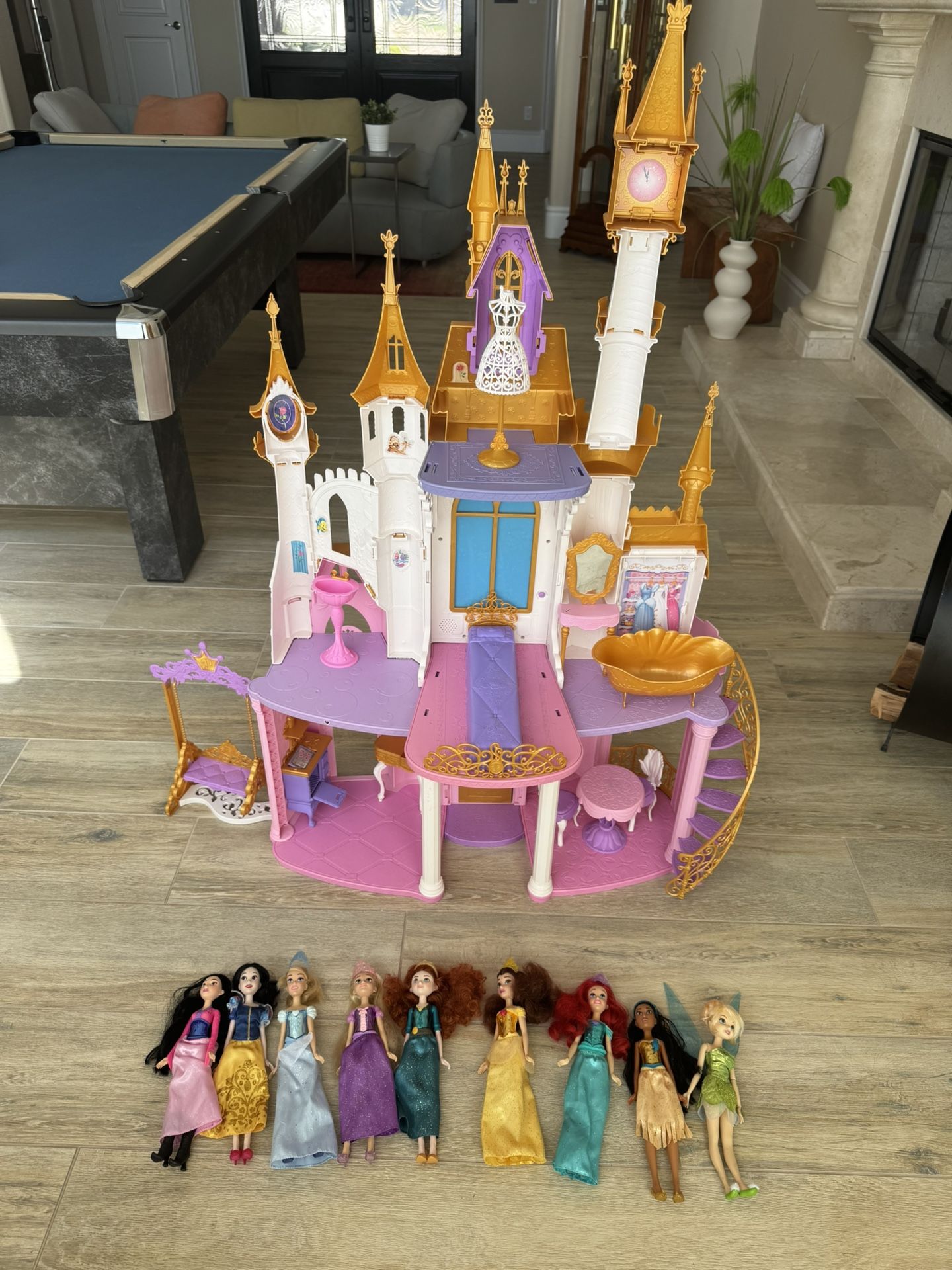 The Disney princess ultimate celebration castle stands a couple inches over 4 feet high with 3 stories and 6 rooms, featuring a classic castle silhouette. With a push of a button includes a musical firework show (sound and light). Includes furniture such as a table, chairs, bed, bathtub, etc. Also includes set of 9 Disney princess dolls with clothes and shoes each. The perfect birthday or Christmas gift!