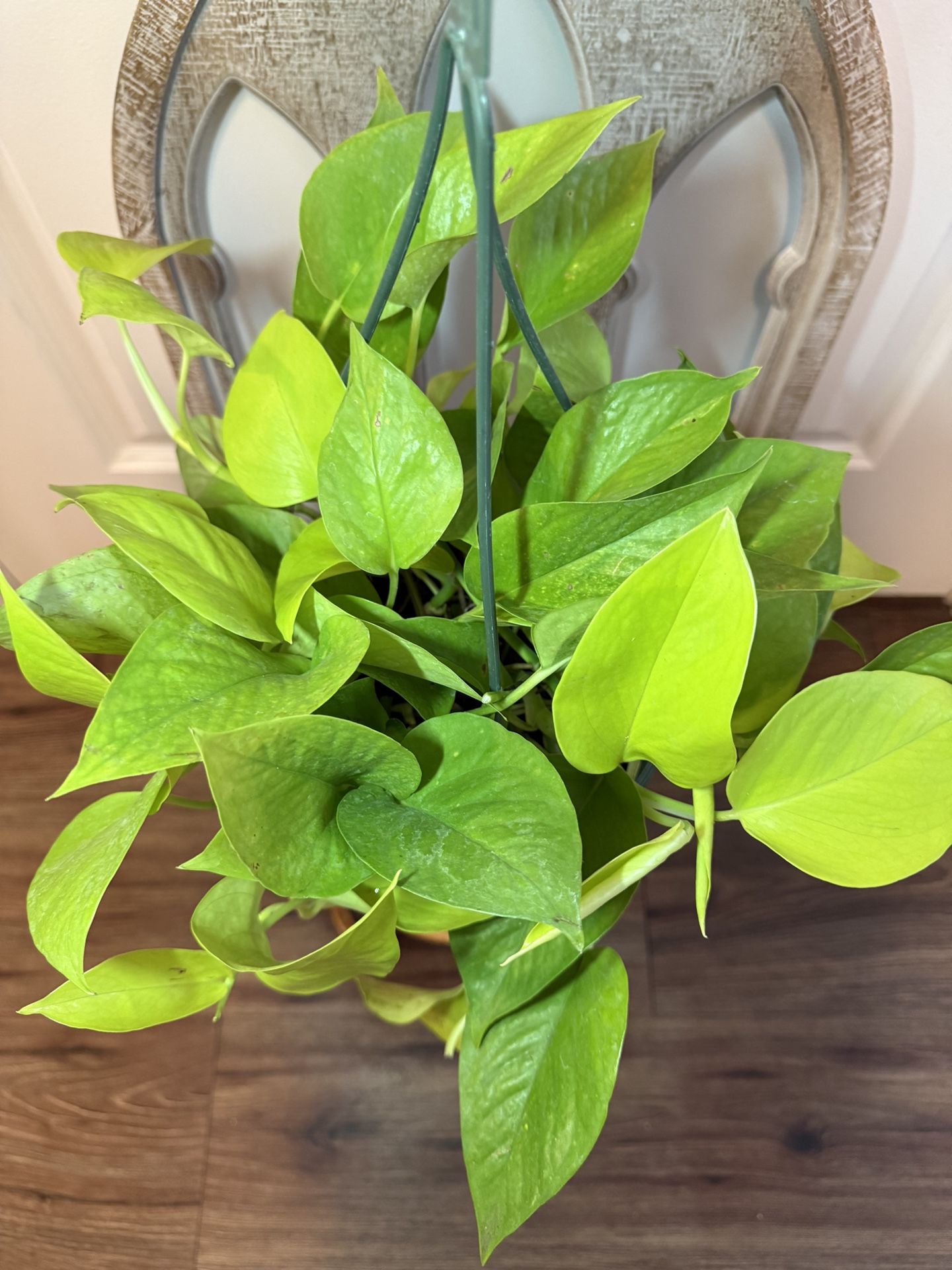 Neon Pothos Vibrant lime green leaves Low maintenance hanging plant Prefers bright indirect light Likes well draining soil 8 inch pot