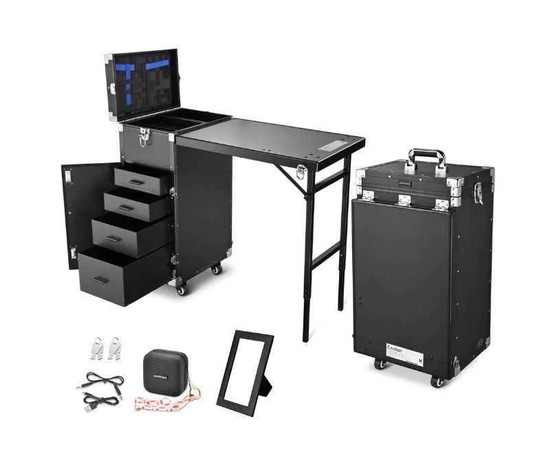 Part Number: 12MKC027-MJT-06.V7 Mobile Makeup Station with 4 spinner wheels and 2 of the wheels are lockable, also the wheels with a detachable design for easy replacement, featuring an expandable floor-standing table and mirror, Bluetooth Speaker, and 4 large capacity drawers. High Quality: · Dual-purpose which features an expandable floor-standing table that can be used as a trolley case or nail art workstation · Music to Relax and Charge o Line-in/DC 5V powers the Bluetooth player and allows playback without the need for an external power cord when powered o Equipped with a portable speaker with AUX cable to play music from your cell phone via Bluetooth, AUX port and TF card · Multiple Construction o Includes a folding tabletop, upper compartment, and lower compartment with 4 removable drawers for nail machines o Upper compartment with removable dividers allows you to adjust the storage space as needed to categorize nail polishes o Elastic band underneath the lid holds different makeup brushes for easy access and can be removed when not in use · Aluminum frame for better support and up to 55 lbs. of weight, flame retardant exterior and metal-clad corners for protection · UL-recognized, side latch locks the table securely to the case when not needed & has 4pcs 360-degree swivel and detachable wheels · A lockable latch with a key on the lid and combination lock on the door provide excellent security for your cosmetics Product Details: · Color Option: Black · Expanded Overall Dimension (LxWxH): 33 1/4" x 16 1/16" x 31 1/8" · Case Overall Dimension (LxWxH): 15 1/16" x 12 3/16" x 27 3/16" · Table Expanded Dimension (LxWxH): 22 7/16" x 15 1/16" x 27 3/16" · Mirror Dimension (WxH): 3 3/4" x 6 7/8" (9.5 x 17.5 cm) · Material: Aluminum Alloy, Fire-Retardant PP, Leather, Metal · Voltage: 110V to 250V, 2200W · Table Capacity: 15.4 lbs (7 kg) · Each Drawer Capacity: 11 lbs (5 kg) · Net Weight: 36 Lbs (16.3 kg) Package Includes: · 1x Trolley Case · 1x Power Cord · 4x Drawers · 1x Independent Case · 1x Bluetooth Speaker · 4x Keys · 1x Screw · 4x Wheels · 1x Manual - Sales tax is added during checkout. We accept cash, Zelle, or credit cards. Credit card transactions will have a 3% surcharge.