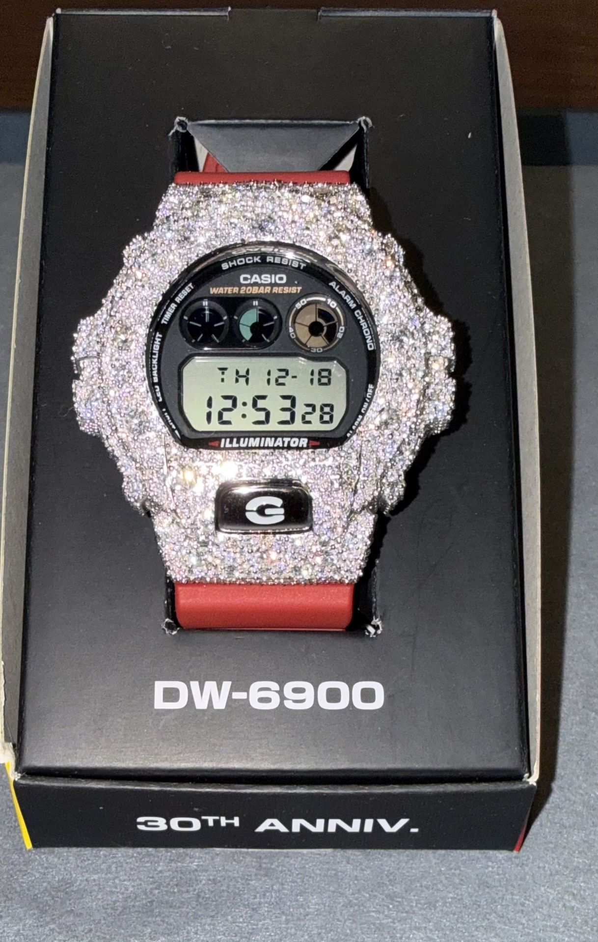 Authentic DW-6900 G Shock watch. It features a stunning 925 sterling silver bezel with moissanite diamonds. If you’re looking for something nice that will fit in your collection, this is it. I have other items as well, get in contact with me
