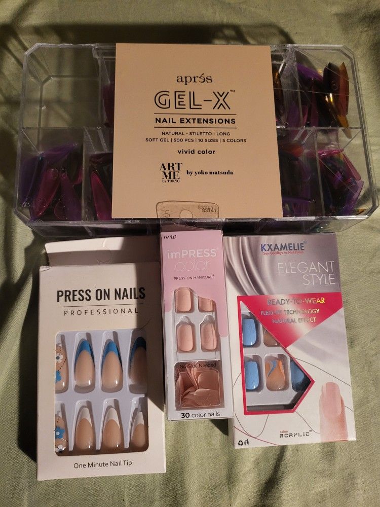 Brand New 4 boxes of nails 2 boxes of press on nails 1 Box of Gel X nail extensions 1 box of elegant style nails