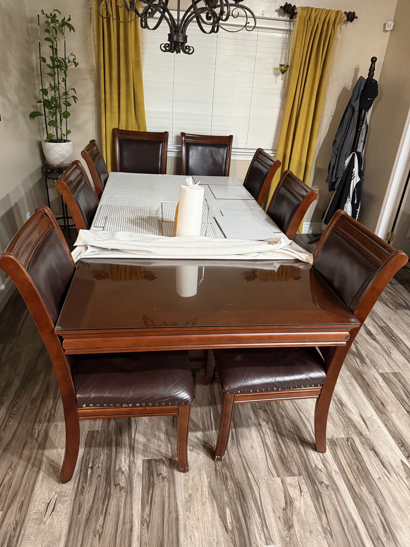 Moving Sale Dining Table 300$ , include 8 chairs , table and chairs in very good condition. coffee Table 60$ candles 10$ both table Lamp 20$-40$ all items very good condition.