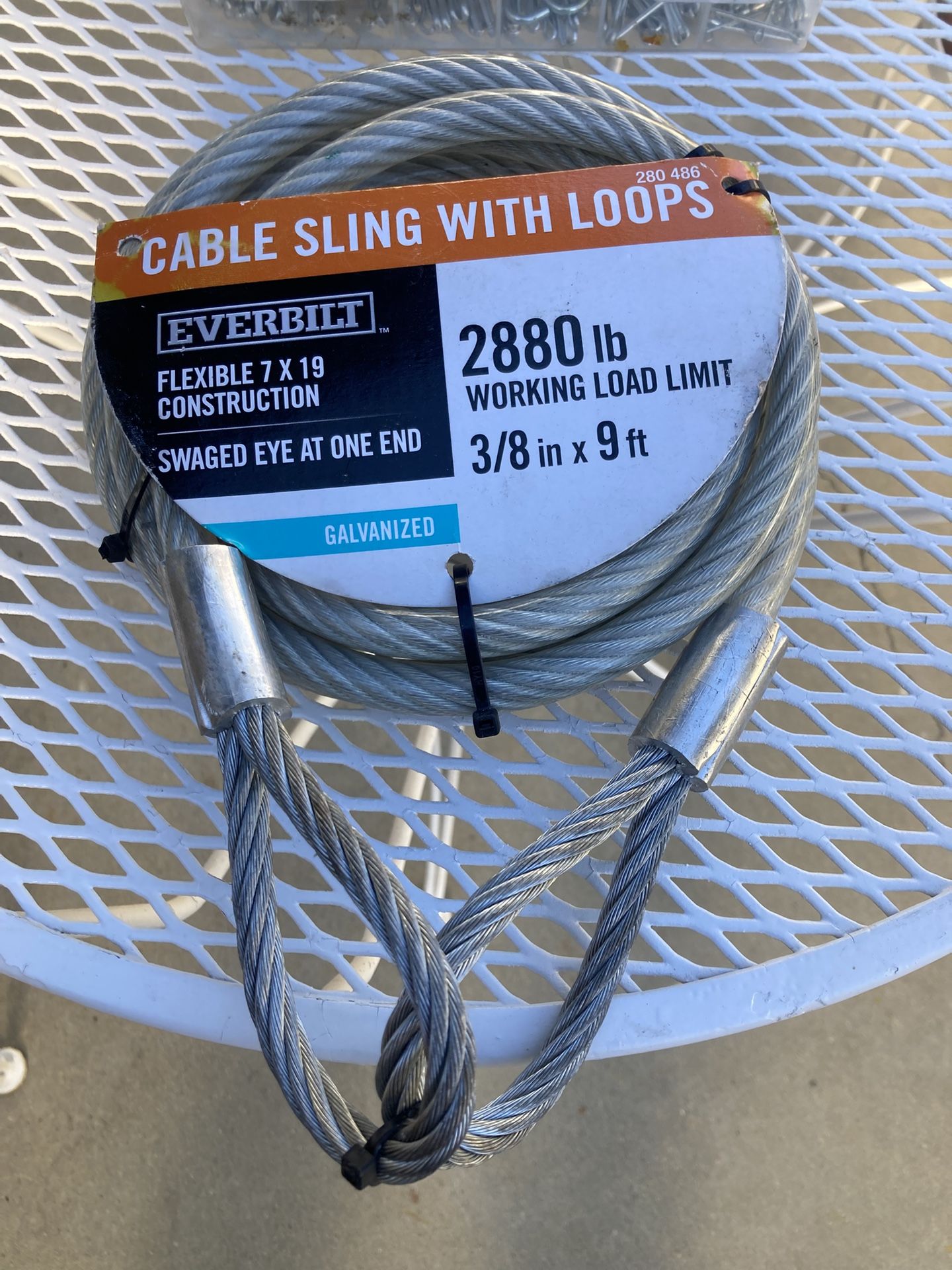 CABLE SLING WITH LOOPS CABLE SLING WITH LOOPS EVERBILT FLEXIBLE 7 X 19 CONSTRUCTION SWAGED EYE AT ONE END GALVANIZED 2880 lb WORKING LOAD LIMIT 3/8 in x 9 ft Brand new original price is $51+tax