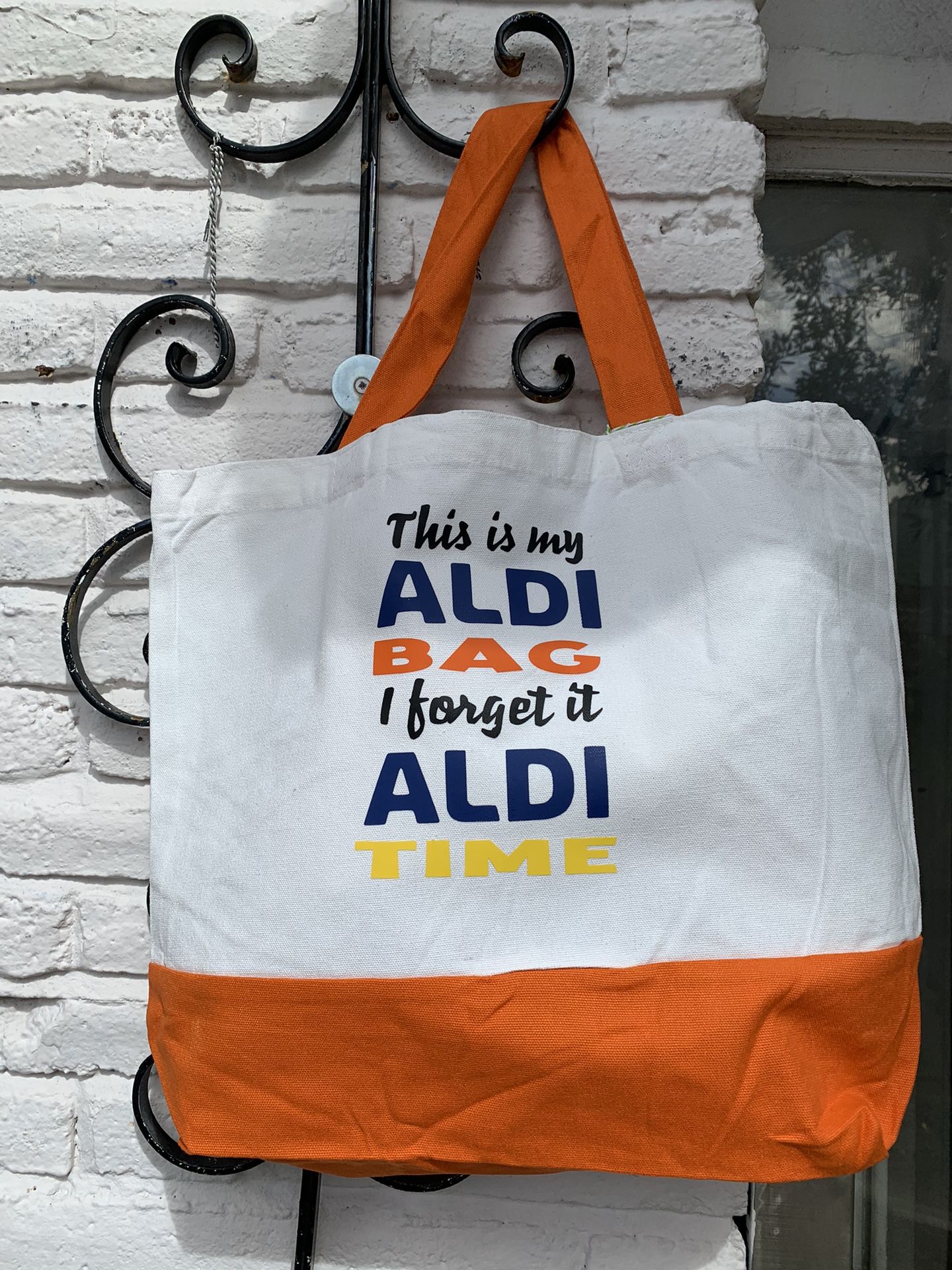 Reusable Grocery Canvas Tote Bag “This is my ALDI bag I forget it ALDI time” 18.5 x 4.7 x 15 inches ( L x W x H) Reusable Canvas is 100% Cotton with a bright a handles and bottom Bag can hold up to 50lbs Machine Wash in Cold Water inside out Tumble Dry on low or line dry for best results Please not that bags may very in color as well as the design Can be customized with color bag and design colors upon availability and time to create.