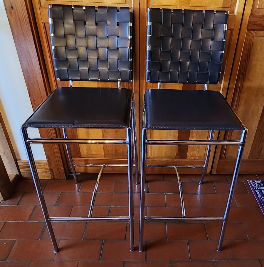 Two black and chrome bar stools with woven leather backs and leather seats. One has minor flaw in seat back. High end and very well made with welded frames. Cash sale please, can meet in the Fairview area.