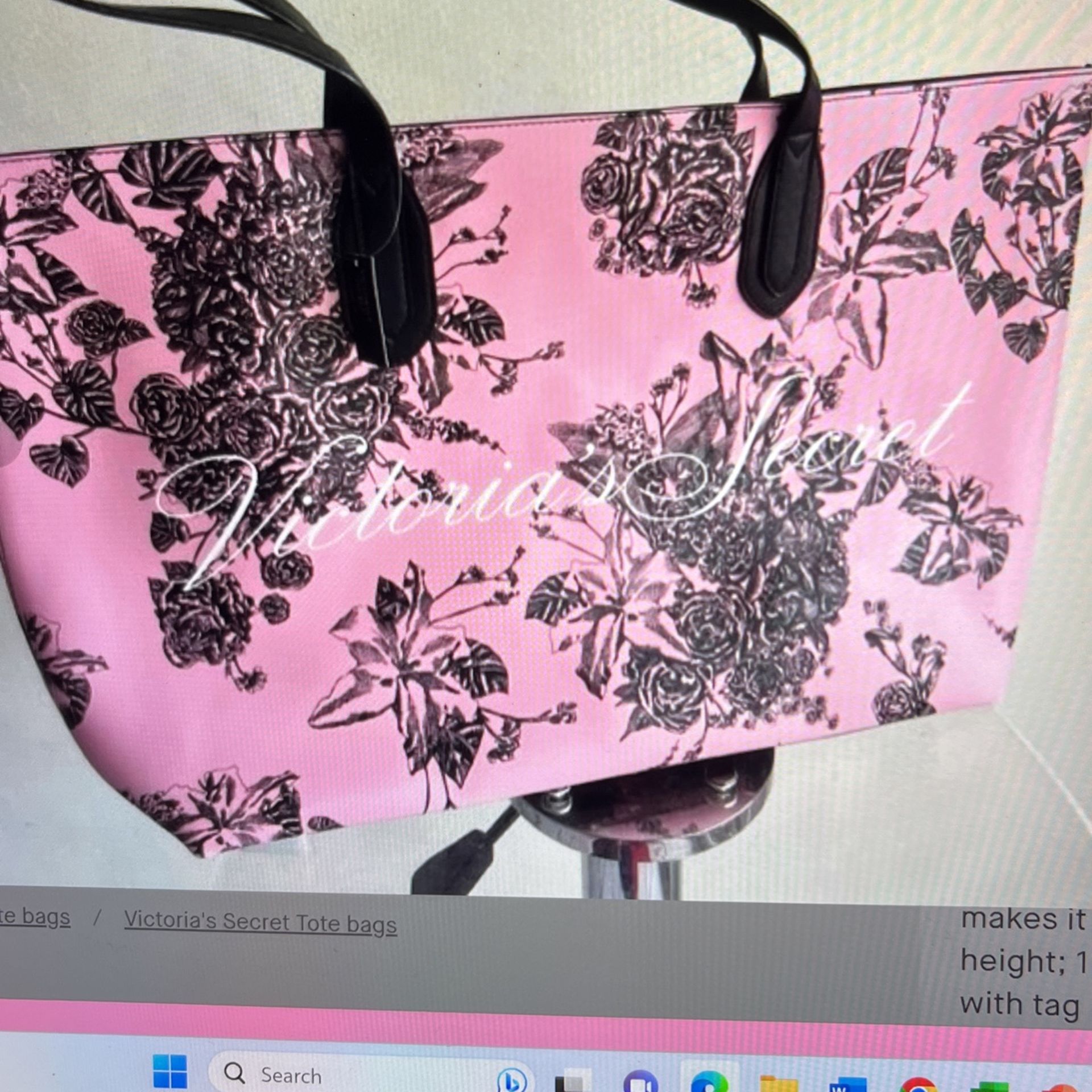 This pink decorated with black flowers makes it look nice and cute and is large enough to feet your usual belongings, including laptops, phone, keys, women staff, very light weight, 1.17 pound, h: 11 in, width: 20in brand new with tag, enjoy it.