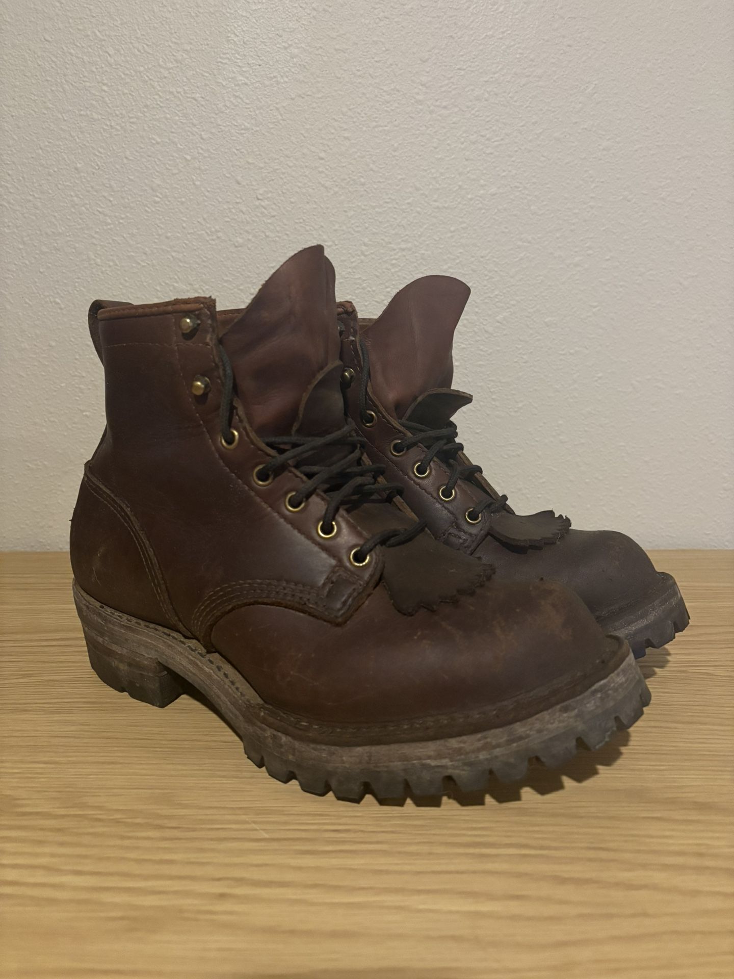 Tough, handcrafted quality from the West Coast Shoe Company (Wesco), known for their premium work boots built in Scappoose, Oregon. These boots feature full-grain brown leather uppers, brass eyelets, and a Vibram lug sole for excellent traction and durability. The interior is fully leather-lined for comfort and long wear. Brand: Wesco (West Coast Shoe Company) Model: Custom lace-up work boots Size: 8.5 EE (wide) Color: Brown Material: 100% leather upper and lining Outsole: Vibram lug sole Features: - Goodyear welt construction (resoleable) - Made in USA Markings: “WJ Exclusive Distributor,” stamped size and code “8½ EE 18 22” inside shaft Condition: Pre-owned, in good used condition with visible wear and scuffs consistent with light to moderate use. Soles show minimal wear and plenty of tread remaining. Leather uppers have some creasing and surface marks but no major damage. Structurally solid and ready for continued use.