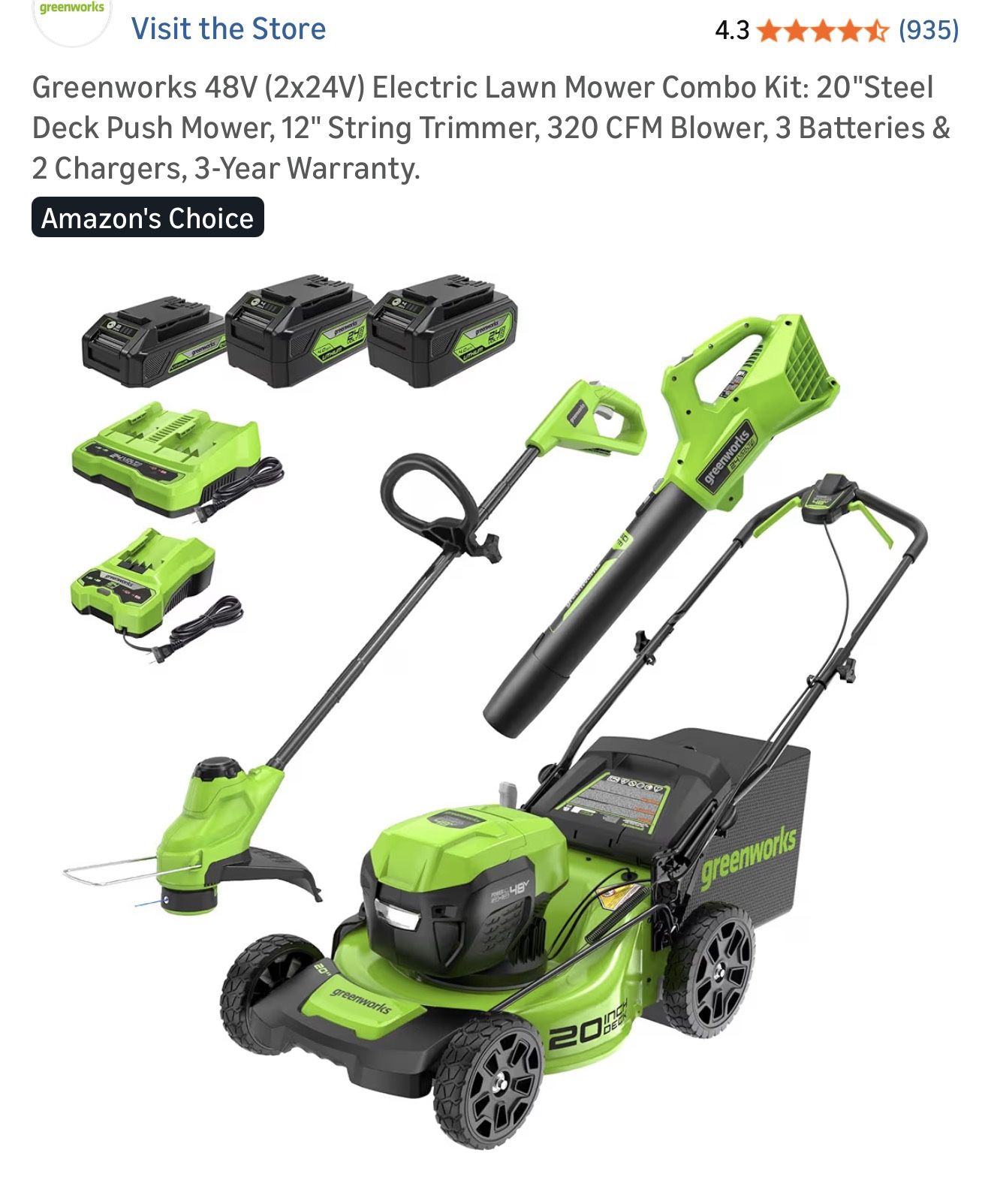 Greenworks 48V (2x24V) Electric Lawn Mower Combo Kit: 20"Steel Deck Push Mower, 12" String Trimmer, 320 CFM Blower, 3 Batteries & 2 Chargers, 3-Year Warranty. New in box