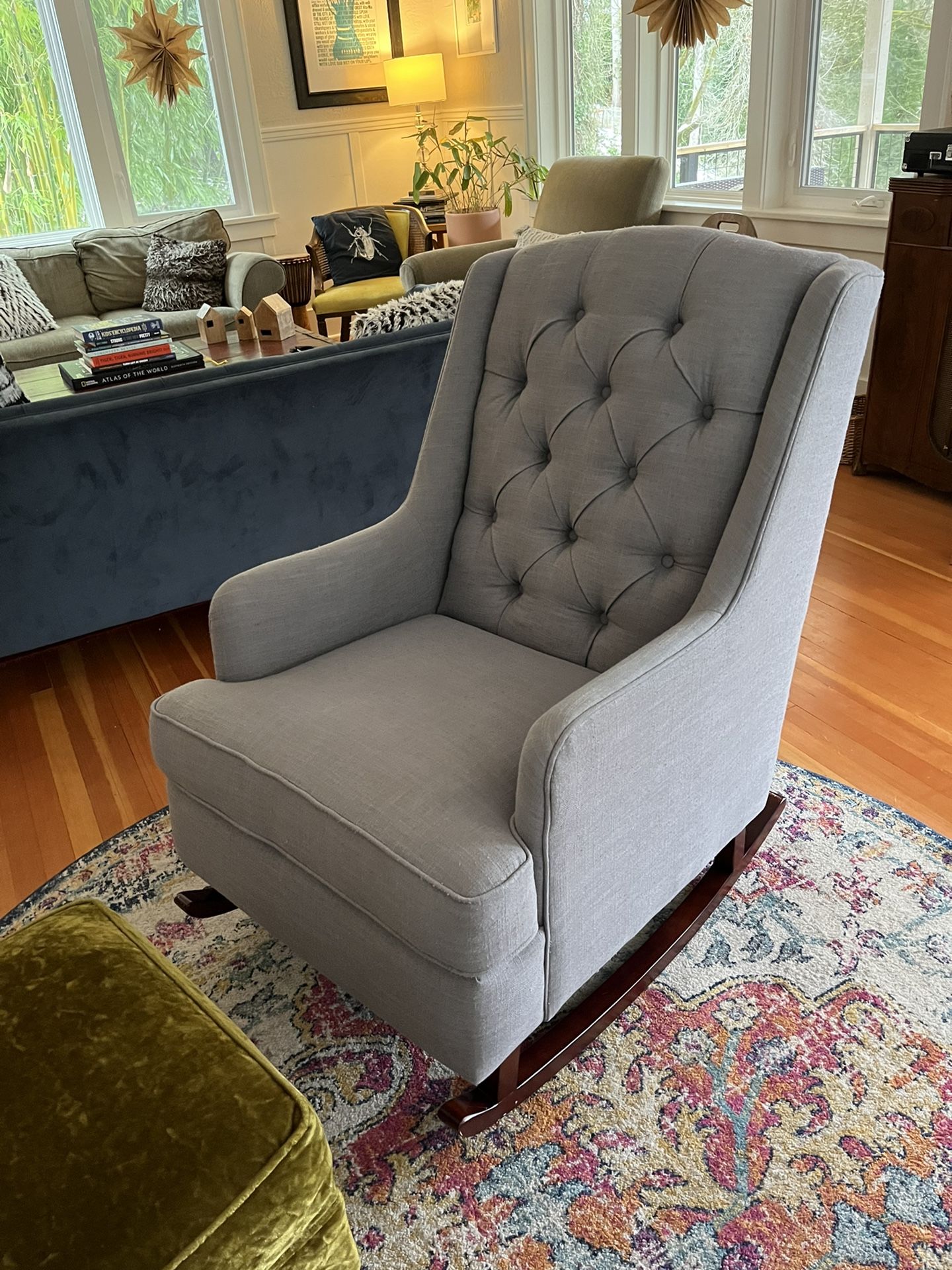 Originally from Target, this grey tufted rocking chair was used for our youngest daughter’s nursery. It is in great condition, despite a few wear and tear marks on the wooden feet of the rocker. It was in a no-pet home up until these last two months when we got two kittens. Still in great condition. Local meetup only. Originally purchased for $400 at Target.