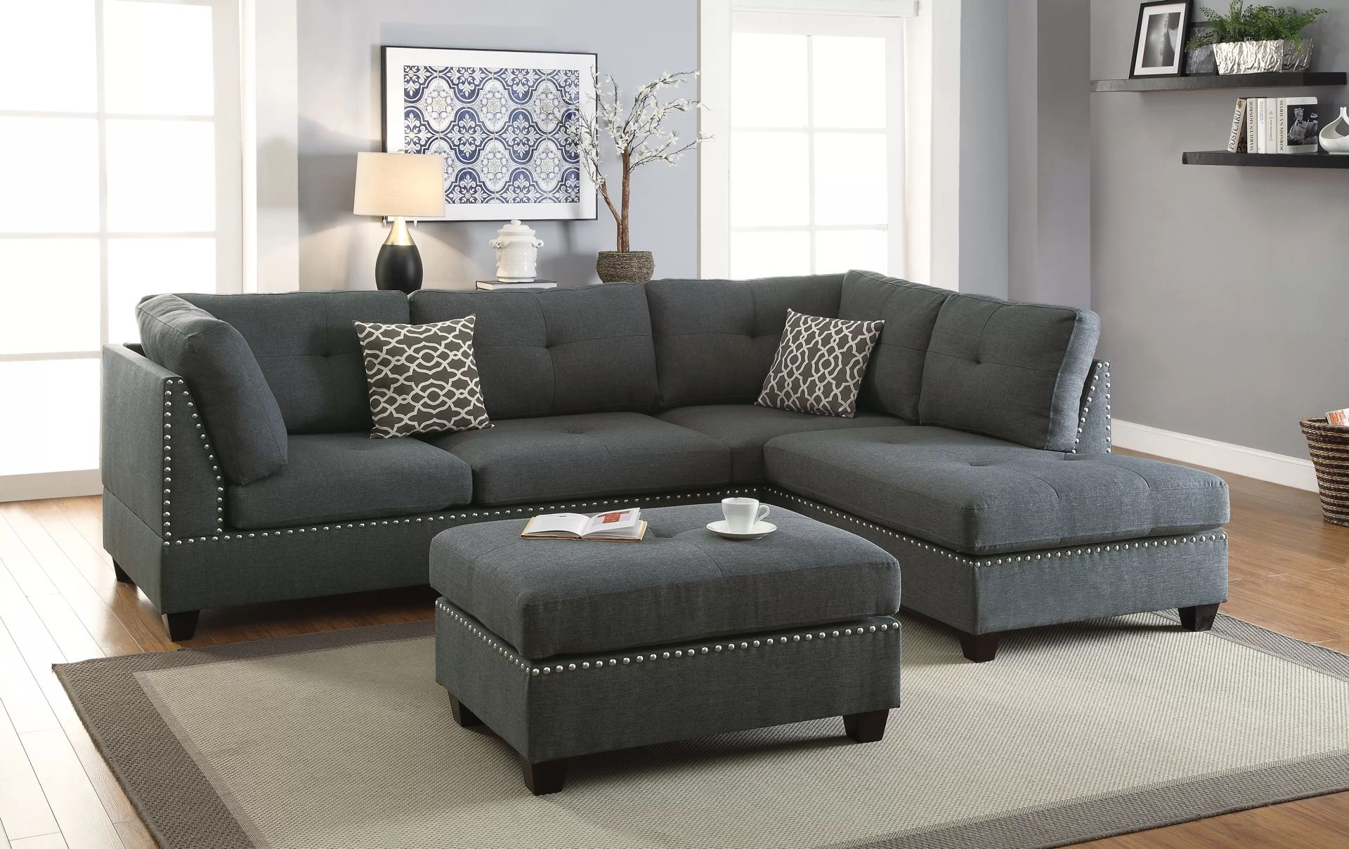 GREY REVERSIBLE CHAISE SECTIONAL WITH OTTOMAN