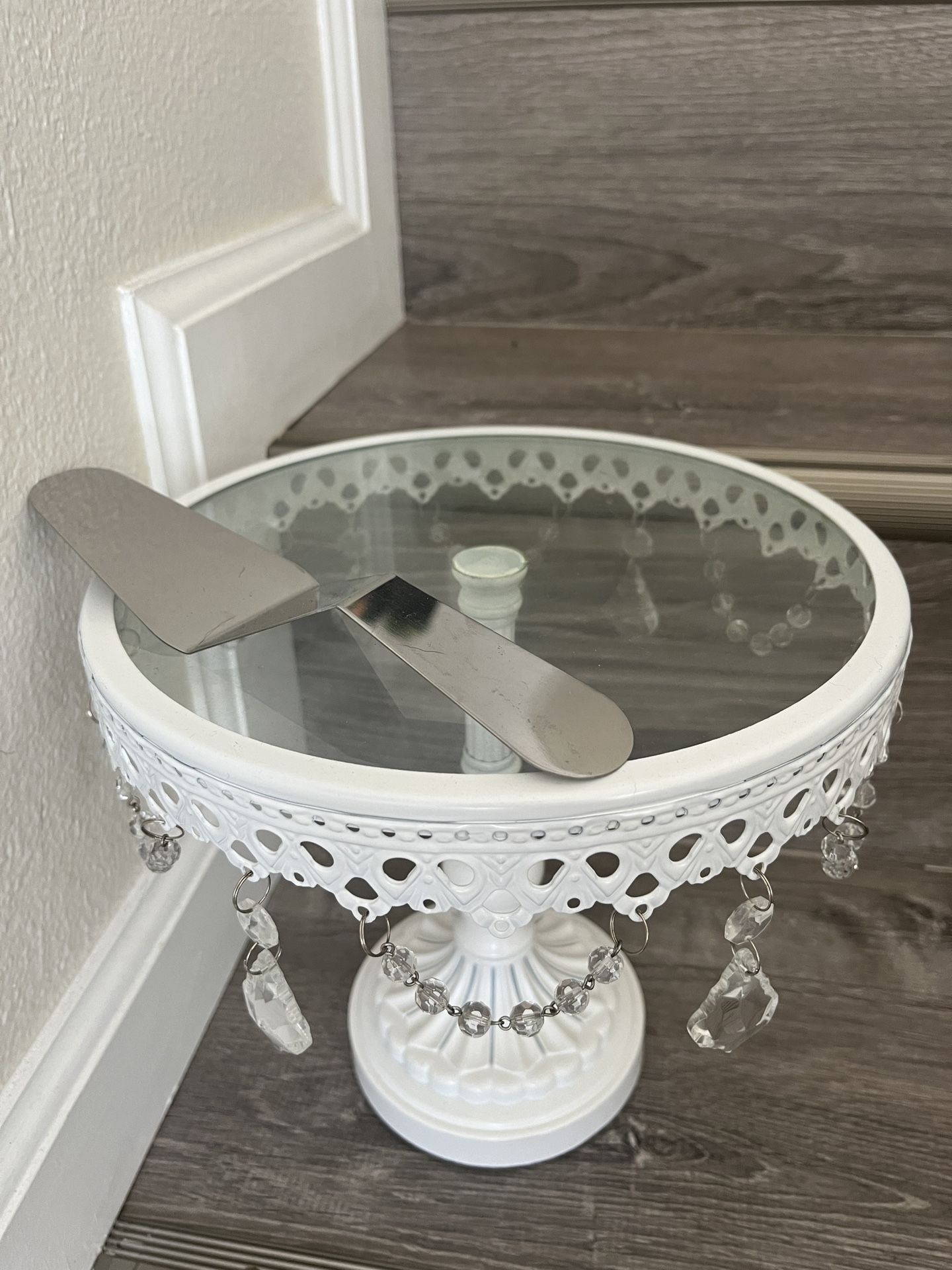Beautiful, high quality cake stand with cake serving utensil. Glass top - 9 1/2” Height - 9”