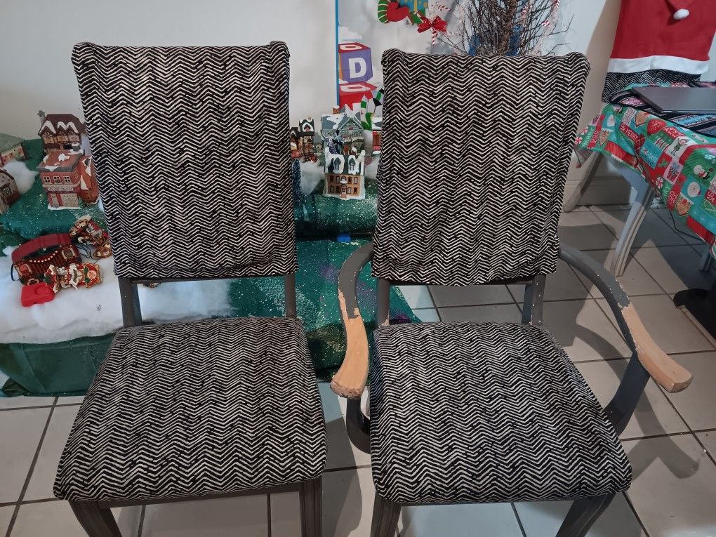 6 dining room chairs...wood..as you can see in the pictures the original color is light brown...I painted them and the paint is coming off...otherwise they are in excellent condition...no tears or anyhing broken... 2 of them have arm rest the other 4 without