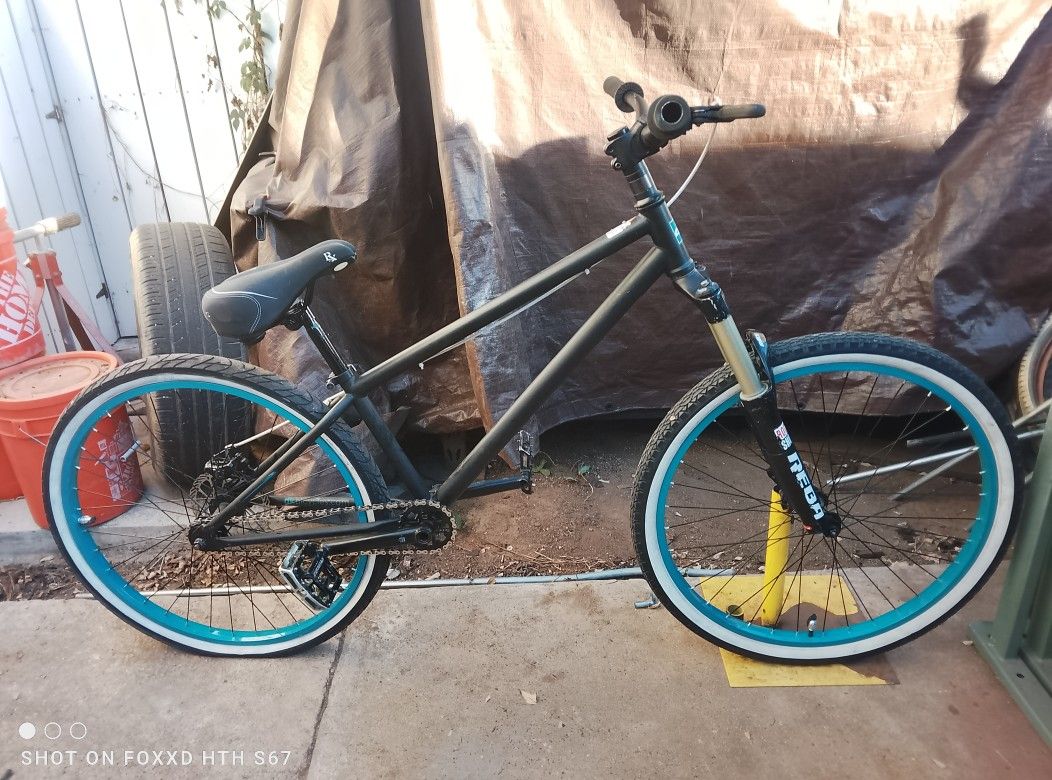 ,WILL TRADE FOR 26" OR BIGGER BMX CRUISER! MICRO GEARED, REBA ROCK SHOX FRONT FORK, FIT CRANK SPROCKET. _factory flat black paint, braided rear disc brake cable Original DK RIMS, SPECIALIZED PEDALS, NICE RIDING BIKE. NEW BEARING THROUGHOUT. Needs new tires.