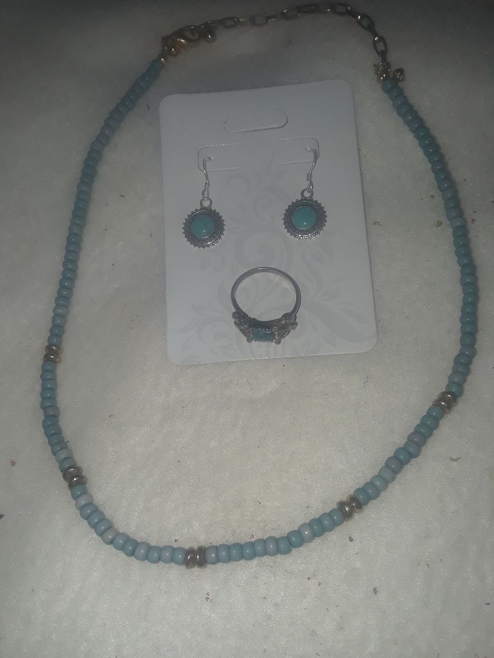 Three Piece Jewelry Set Includes: Handmade Turquoise & Gold Colored Beaded Necklace, Square Shaped Marbled Turquoise Ring, Sterling Silver (925) Round Turquoise Colored Earrings. ☆Listing Price Is Negotiable ☆Follow My Page For New Items Added Daily!