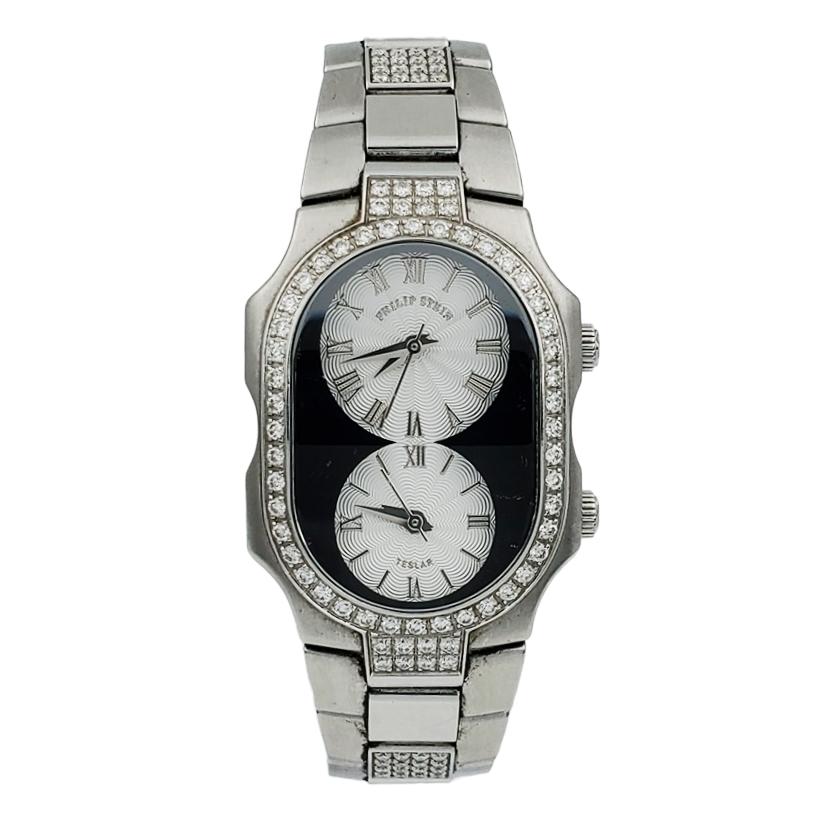 Ladies Philip Stein Teslar Stainless Steel Watch with Diamond Bracelet, Silver Dial and Diamond Bezel. (Pre-Owned) Gender: Ladies. Type: Wristwatch. Dial Color: Silver. Brand: Philip Stein. Condition: Excellent. Band/Strap: Stainless Steel. Box: Includes Aftermarket Box. Warranty: 1 Year Service Warranty.