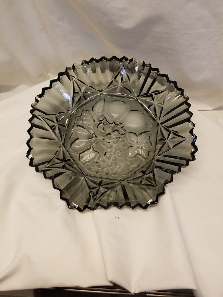 This is a smokey iridescent glass platter with a fruit design by Pioneer federal glass co It picks up the light beautifully 10 1/2 in in diameter $10 OBO cash only please