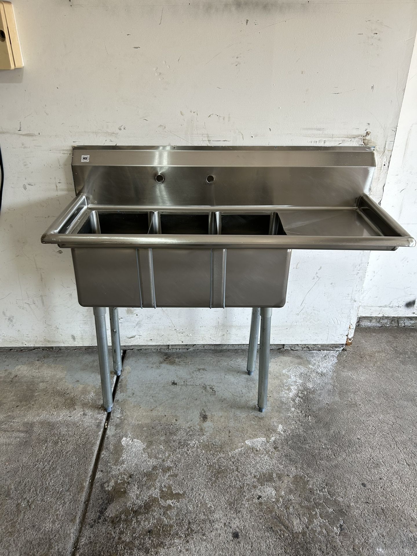 NSF approved commercial grade 48" x 20" three compartment stainless steel work prep sync. Great for restaurant bar workshop garage food truck convenience store Taqueria pizzeria bakery festival. Price is 550 like new condition.
