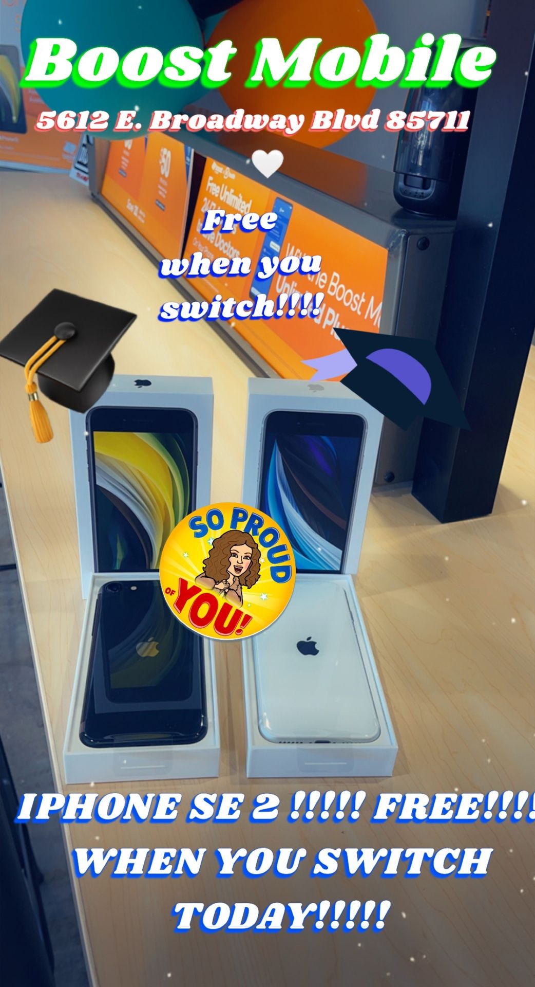 Congratulations to All the graduates 🎓 of 2021-2022!!!! Boost Mobile wants to take care of you all and your families with saving some big money this graduation season!!!! But still get y’all looking great and staying in style with the new IPhone SE 2 for !!!!!Free!!!!! right now when you switch from your current phone carrier and stepping into the best prepaid services out there with no extra hidden fees every month! Boost Mobile on Broadway and craycroft hurry in so we can get you all setup