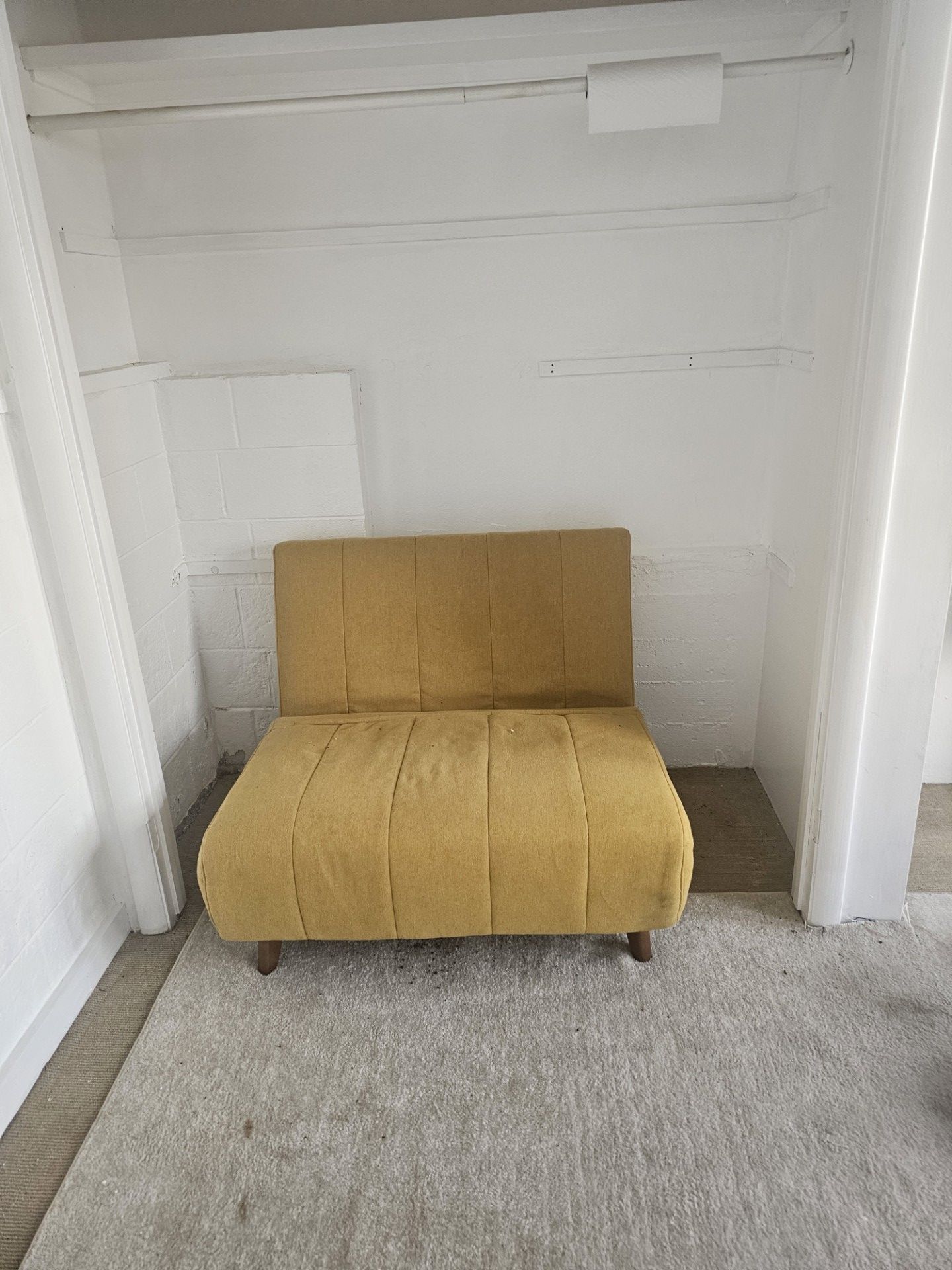 Used in good condition All specifications Material Polyester, Foam, Wood Frame, Birch Wood Legs Color Yellow Chair style Convertible Fill material Polyester, Foam Seat height 16.5 in Seat depth 22.5 in Seat width 41 in Assembled product height 32 in Max load 300 lb Features Tufted Brand A&D Home Frame material Wood Frame, Pine Leg material Birch Wood Legs Frame color Wood Leg color Coffee