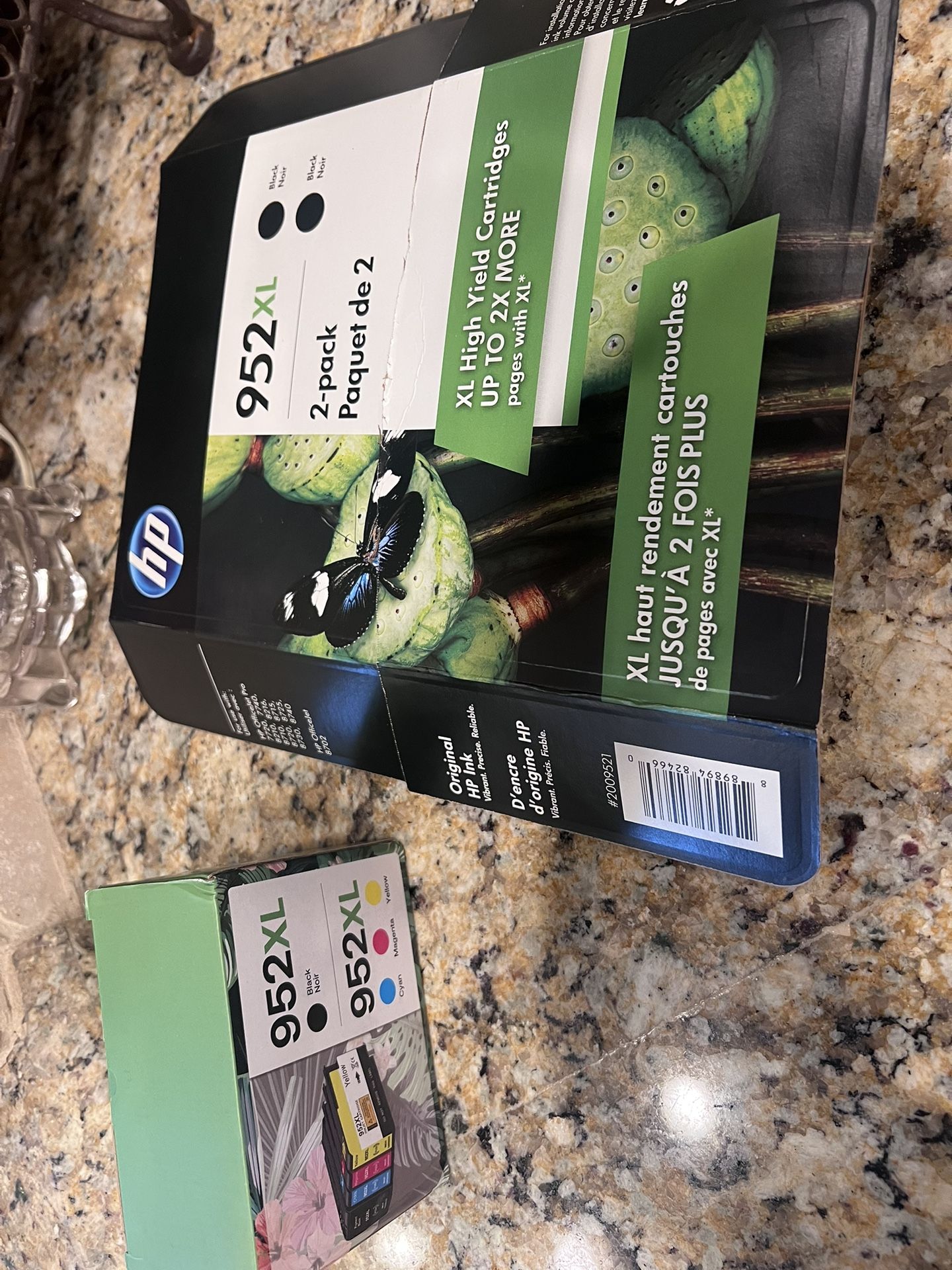 952 hp ink, 1- dbl color and black, 1- 2 pack black. Switched out printer no longer needed all brand new never used. $100 for all packs