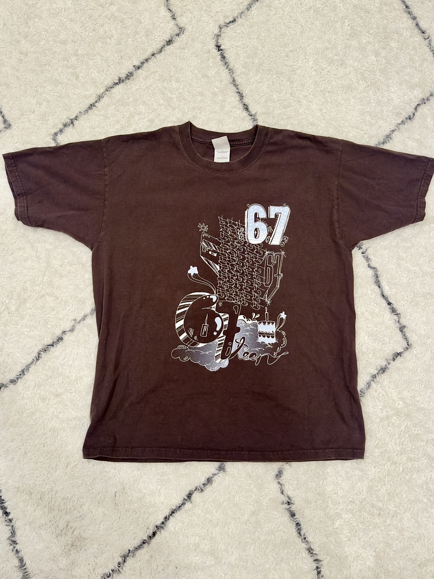 t-shirt commemorating the attendance of FFC’s 67th birthday in Geyserville, CA. Cool sky blue and white illustration on the front, event info on the back Natural colorfade from age no holes or stains