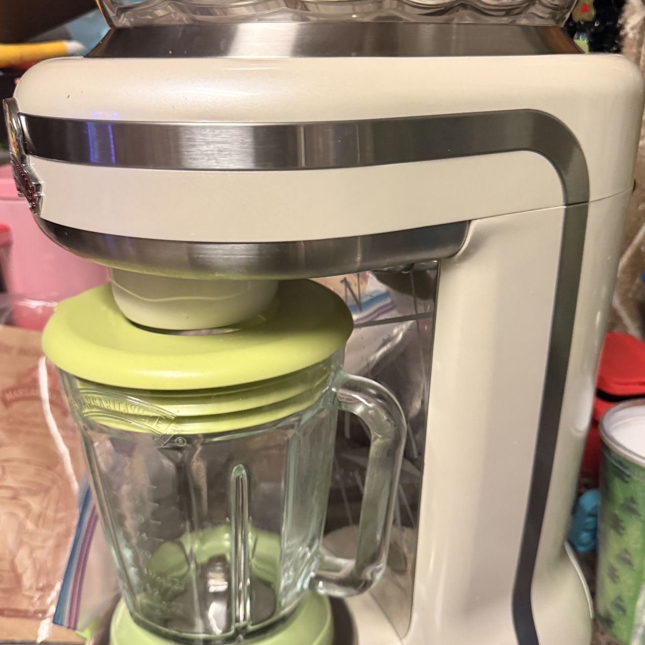 Margaritaville Key West DM1000 Premium Frozen Concoction Maker Margarita Machine. The Margaritaville Key West DM1000 Premium Frozen Concoction Maker is a green electric appliance capable of blending and crushing ice. It has a 36 oz capacity and features three speeds, making it perfect for making frozen drinks. Made of plastic and glass, this standard blender and ice shaver comes with a container, blender, and base. With a power of 450 W and a dishwasher-safe design.